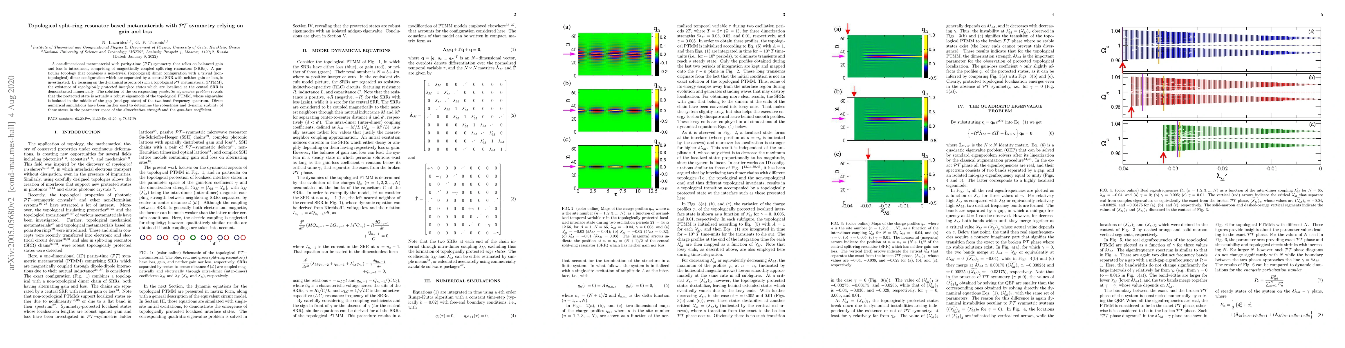 A one-dimensional metamaterial with parity-time (${\cal PT}$) symmetry that relies on balanced gain and loss is introduced, comprising of magnetically coupled split-ring resonators (SRRs). A particular topology that combines a non-trivial (topological) dimer configuration with a trivial (non-topological) dimer configuration which are separated by a central SRR with neither gain or loss, is investigated. By focusing on the dynamical aspects of such a topological ${\cal PT}$ metamaterial (PTMM), the existence of {\em topologically protected interface states} which are localized at the central SRR is demonstrated numerically. The solution of the corresponding {\em quadratic eigenvalue problem} reveals that the protected state is actually a robust eigenmode of the topological PTMM, whose eigenvalue is isolated in the middle of the gap (mid-gap state) of the two-band frequency spectrum. Direct numerical simulations have been further used to determine the robustness and dynamic stability of these states in the parameter space of the {\em dimerization strength} and the {\em gain-loss coefficient}.