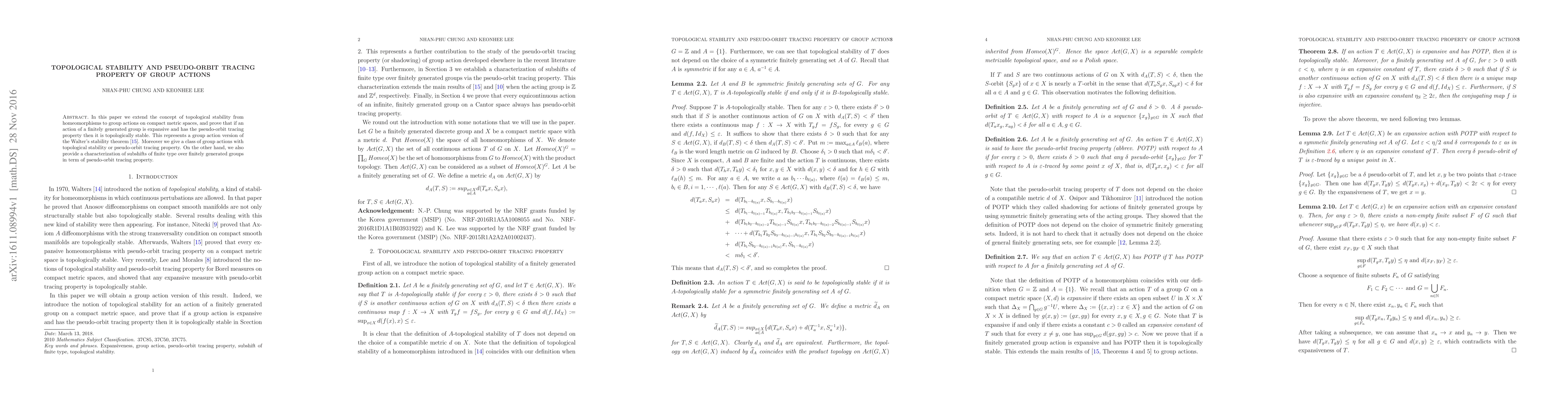 This paper extends topological stability to group actions on compact metric spaces, proving that expansive actions with the pseudo-orbit tracing property are topologically stable. It also provides a class of such stable group actions and characterizes subshifts of finite type in terms of the pseudo-orbit tracing property.