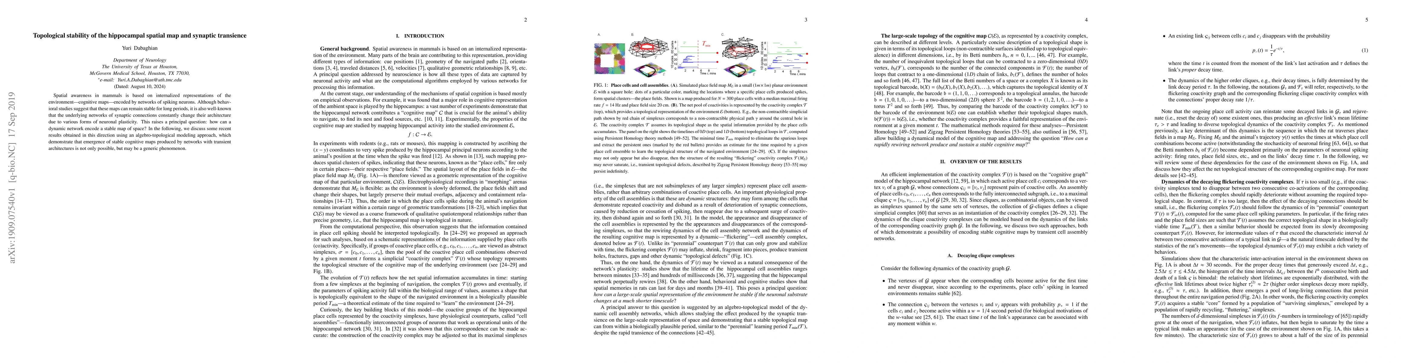 This paper explores how dynamic neuronal networks can maintain stable cognitive maps despite constant synaptic changes, using an algebro-topological modeling approach to demonstrate that stable spatial representations can emerge from transient architectures.