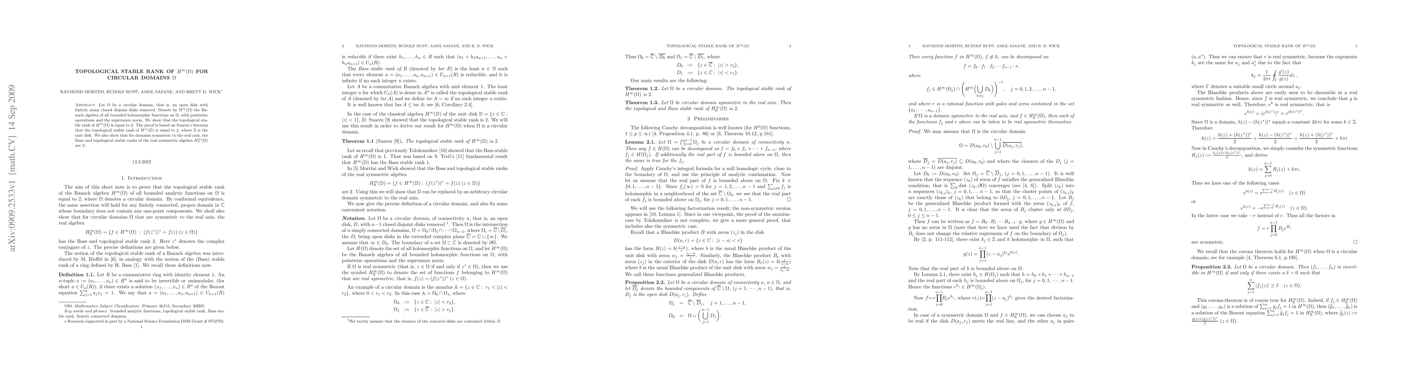The paper investigates the topological stable rank of the Banach algebra $H^\infty(\Omega)$ for circular domains $\Omega$, proving it equals 2. It leverages Suarez's theorem for the unit disk and demonstrates that symmetric domains yield a topological stable rank of 2 for the real symmetric algebra $H^\infty_\R(\Omega)$.