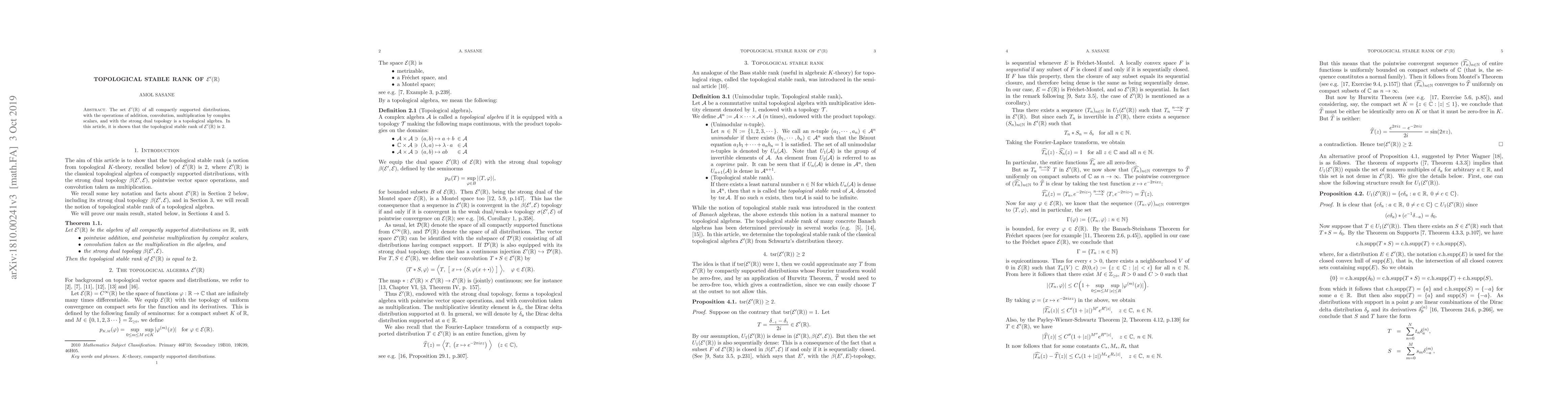 The set $\mathcal{E}'(\mathbb{R})$ of all compactly distributions, with the operations of addition, convolution, multiplication by complex scalars, and with the strong dual topology is a topological algebra. In this article, it is shown that the topological stable rank of $\mathcal{E}'(\mathbb{R})$ is 2.