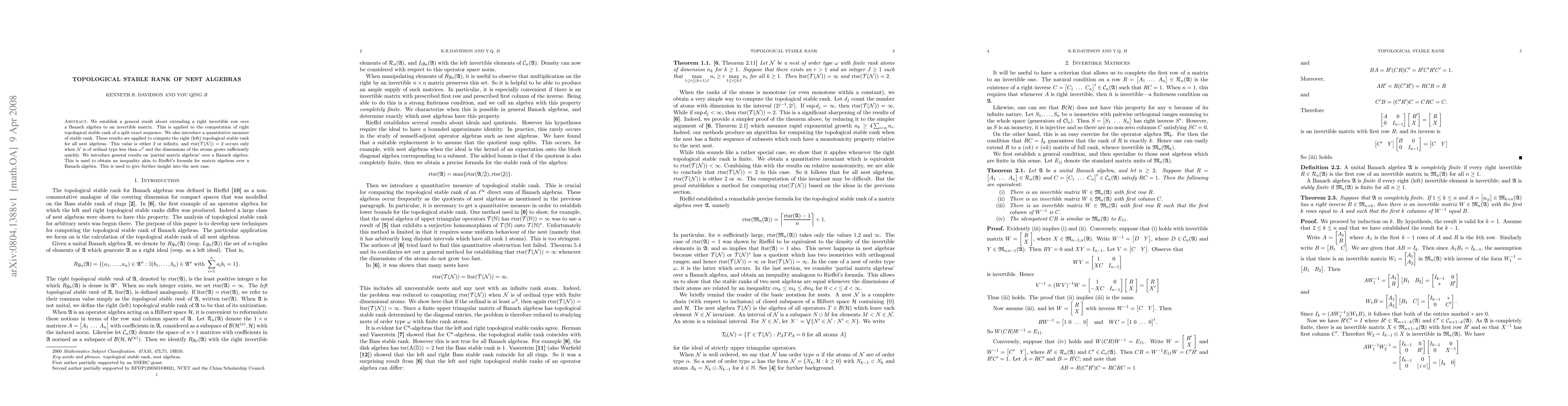 We establish a general result about extending a right invertible row over a Banach algebra to an invertible matrix. This is applied to the computation of right topological stable rank of a split exact sequence. We also introduce a quantitative measure of stable rank. These results are applied to compute the right (left) topological stable rank for all nest algebras. This value is either 2 or infinity, and rtsr(T(N)) = 2 occurs only when N is of ordinal type less than omega^2 and the dimensions of the atoms grows sufficiently quickly. We introduce general results on `partial matrix algebras' over a Banach algebra. This is used to obtain an inequality akin to Rieffel's formula for matrix algebras over a Banach algebra. This is used to give further insight into the nest case.