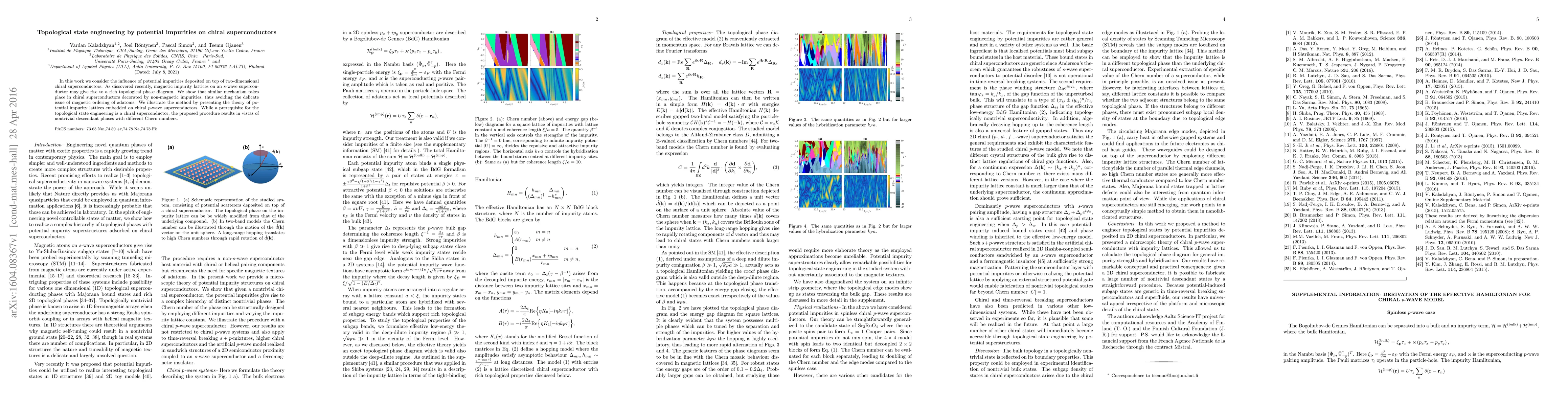 In this work we consider the influence of potential impurities deposited on top of two-dimensional chiral superconductors. As discovered recently, magnetic impurity lattices on an $s$-wave superconductor may give rise to a rich topological phase diagram. We show that similar mechanism takes place in chiral superconductors decorated by non-magnetic impurities, thus avoiding the delicate issue of magnetic ordering of adatoms. We illustrate the method by presenting the theory of potential impurity lattices embedded on chiral $p$-wave superconductors. While a prerequisite for the topological state engineering is a chiral superconductor, the proposed procedure results in vistas of nontrivial descendant phases with different Chern numbers.