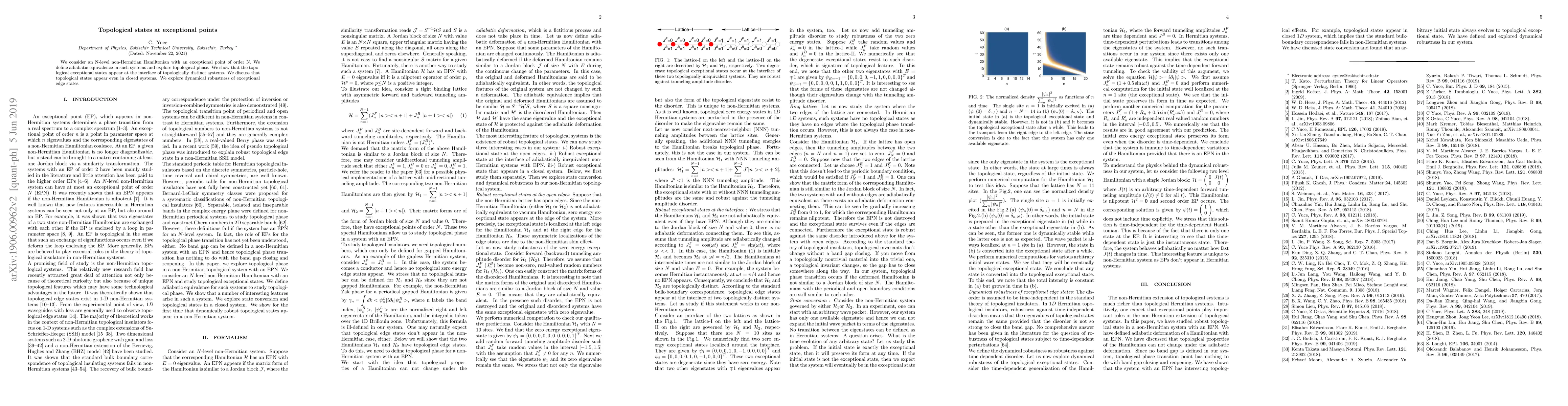 We consider an N-level non-Hermitian Hamiltonian with an exceptional point of order N. We define adiabatic equivalence in such systems and explore topological phase. We show that the topological exceptional states appear at the interface of topologically distinct systems. We discuss that topological states appear even in closed systems. We explore dynamical robustness of exceptional edge states.