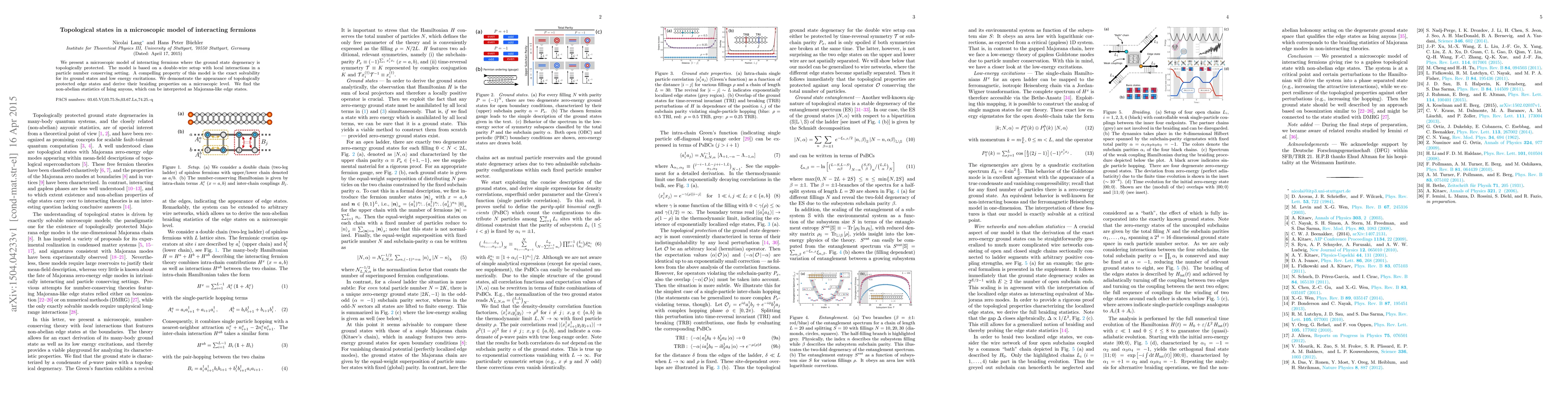 We present a microscopic model of interacting fermions where the ground state degeneracy is topologically protected. The model is based on a double-wire setup with local interactions in a particle number conserving setting. A compelling property of this model is the exact solvability for its ground states and low energy excitations. We demonstrate the appearance of topologically protected edge states and derive their braiding properties on a microscopic level. We find the non-abelian statistics of Ising anyons, which can be interpreted as Majorana-like edge states.
