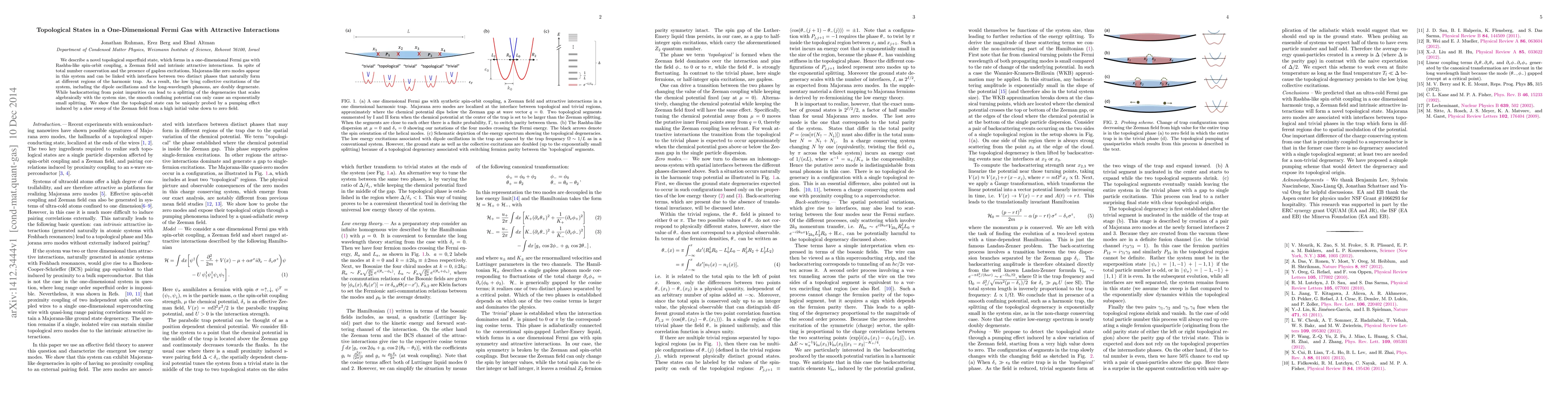 This paper explores a novel topological superfluid state in a one-dimensional Fermi gas with attractive interactions, spin-orbit coupling, and a Zeeman field. It reveals the presence of Majorana-like zero modes and doubly degenerate low-lying excitations, with unique probing via a pumping effect during Zeeman field sweeps.