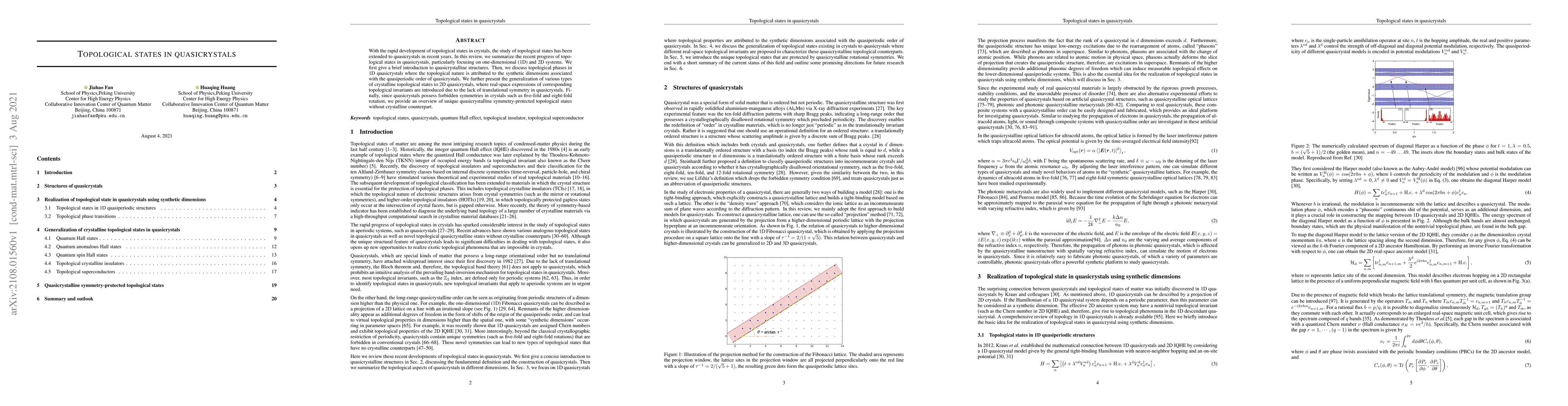 This paper reviews recent advancements in topological states within quasicrystals, emphasizing 1D and 2D systems. It introduces quasicrystalline structures and discusses topological phases in 1D quasicrystals, followed by the generalization of crystalline topological states to 2D quasicrystals, highlighting unique quasicrystalline symmetry-protected topological states.