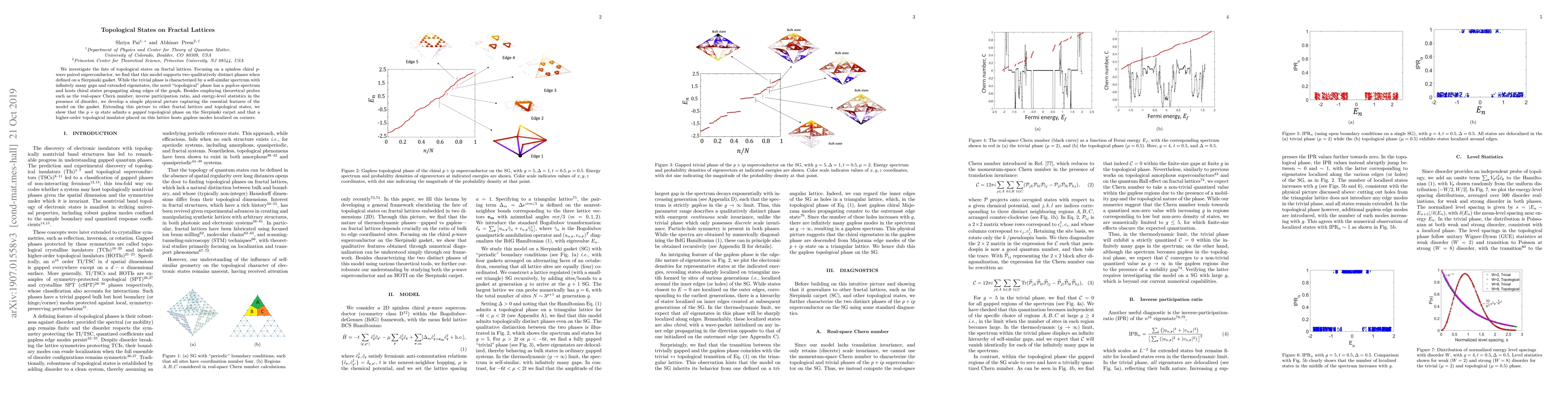 This paper explores topological states on fractal lattices, specifically a spinless chiral p-wave superconductor on a Sierpinski gasket. It reveals two distinct phases: a trivial phase with a self-similar spectrum and extended states, and a topological phase with a gapless spectrum and chiral edge states. The study also extends findings to other fractal lattices, showing similar topological behaviors.