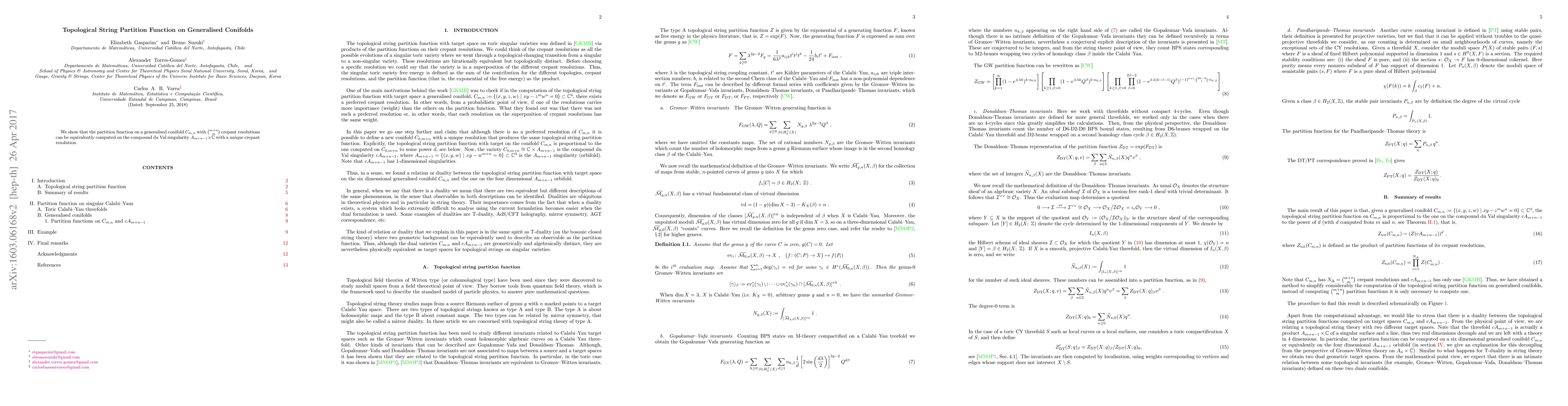 We show that the partition function on a generalised conifold $C_{m,n}$ with ${m+n \choose m}$ crepant resolutions can be equivalently computed on the compound du Val singularity $A_{m+n-1}\times \mathbb C$ with a unique crepant resolution.