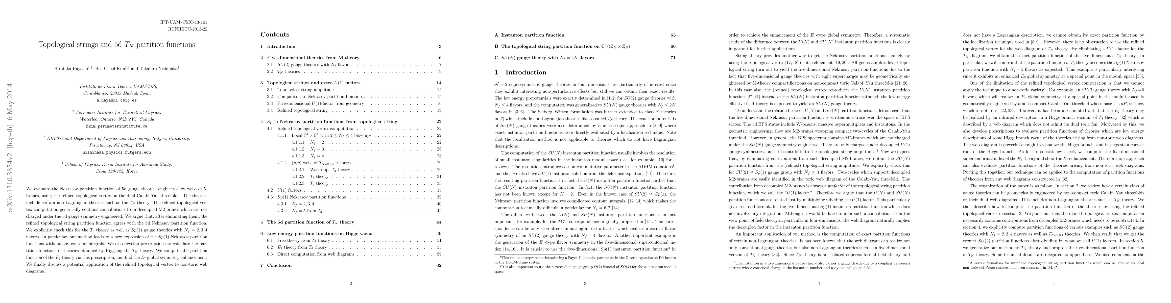 This paper evaluates the 5d Nekrasov partition function for gauge theories, including non-Lagrangian T_N theories, using refined topological vertex computations and finds agreement post elimination of uncharged M2-branes. It introduces new expressions for Sp(1) partition functions and computes the E_7 theory partition function, revealing global symmetry enhancement.
