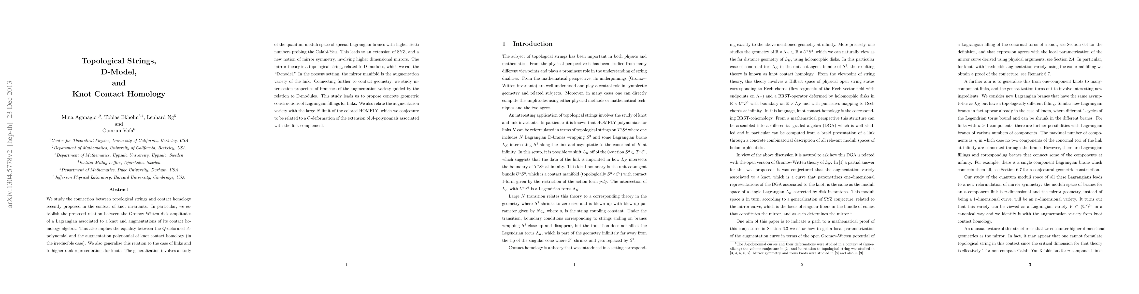 We study the connection between topological strings and contact homology recently proposed in the context of knot invariants. In particular, we establish the proposed relation between the Gromov-Witten disk amplitudes of a Lagrangian associated to a knot and augmentations of its contact homology algebra. This also implies the equality between the Q-deformed A-polynomial and the augmentation polynomial of knot contact homology (in the irreducible case). We also generalize this relation to the case of links and to higher rank representations for knots. The generalization involves a study of the quantum moduli space of special Lagrangian branes with higher Betti numbers probing the Calabi-Yau. This leads to an extension of SYZ, and a new notion of mirror symmetry, involving higher dimensional mirrors. The mirror theory is a topological string, related to D-modules, which we call the "D-model." In the present setting, the mirror manifold is the augmentation variety of the link. Connecting further to contact geometry, we study intersection properties of branches of the augmentation variety guided by the relation to D-modules. This study leads us to propose concrete geometric constructions of Lagrangian fillings for links. We also relate the augmentation variety with the large N limit of the colored HOMFLY, which we conjecture to be related to a Q-deformation of the extension of A-polynomials associated with the link complement.