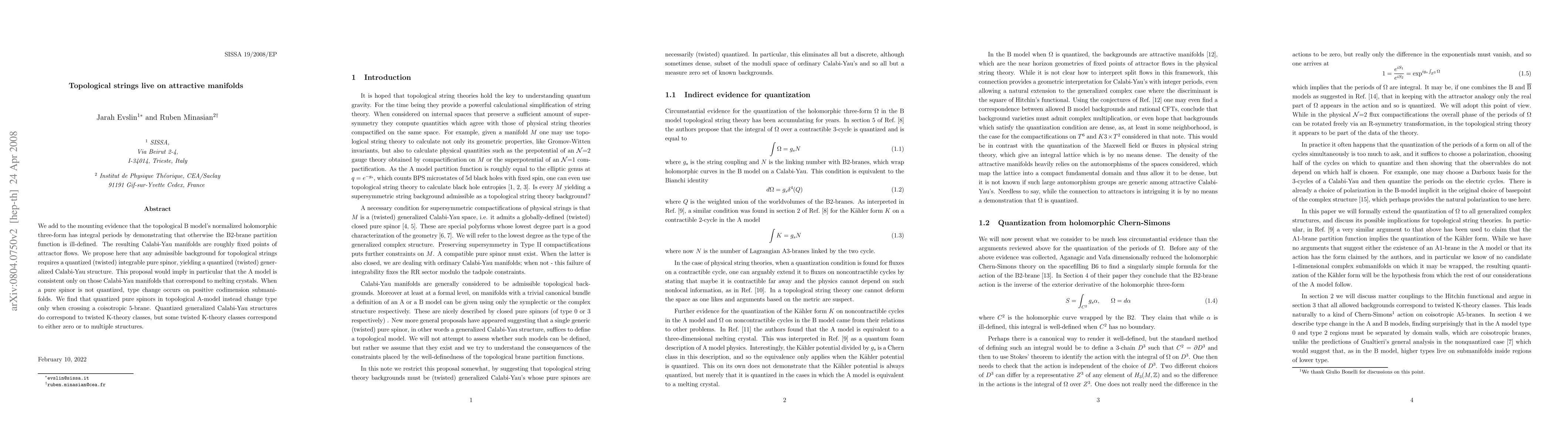 We add to the mounting evidence that the topological B model's normalized holomorphic three-form has integral periods by demonstrating that otherwise the B2-brane partition function is ill-defined. The resulting Calabi-Yau manifolds are roughly fixed points of attractor flows. We propose here that any admissible background for topological strings requires a quantized (twisted) integrable pure spinor, yielding a quantized (twisted) generalized Calabi-Yau structure. This proposal would imply in particular that the A model is consistent only on those Calabi-Yau manifolds that correspond to melting crystals. When a pure spinor is not quantized, type change occurs on positive codimension submanifolds. We find that quantized pure spinors in topological A-model instead change type only when crossing a coisotropic 5-brane. Quantized generalized Calabi-Yau structures do correspond to twisted K-theory classes, but some twisted K-theory classes correspond to either zero or to multiple structures.