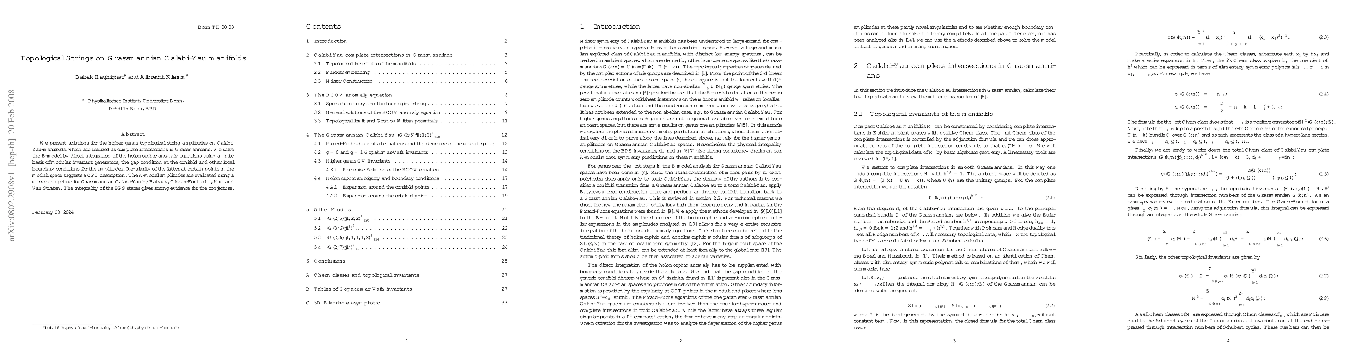 This paper solves higher genus topological string amplitudes on Grassmannian Calabi-Yau manifolds by integrating holomorphic anomaly equations using modular invariants, suggesting a CFT description. The A-model amplitudes are confirmed via a mirror conjecture, supported by the integrality of BPS states.