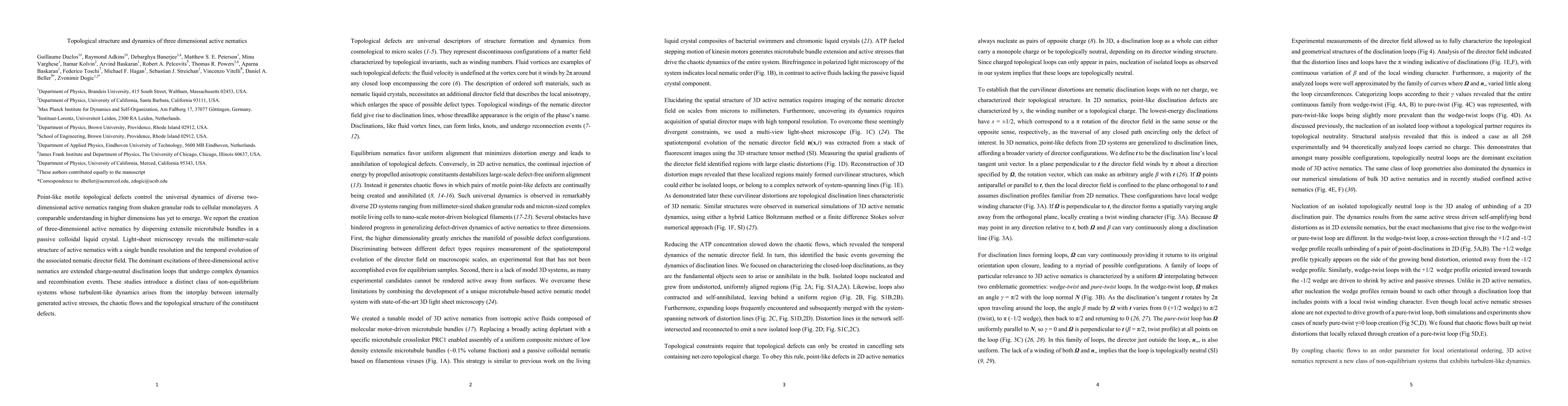 This paper explores the topological dynamics of three-dimensional active nematics, created by dispersing microtubule bundles in a colloidal liquid crystal. It identifies extended disclination loops as the primary excitations, revealing their complex dynamics and the turbulent-like behavior arising from the interplay between active stresses and defect topology.