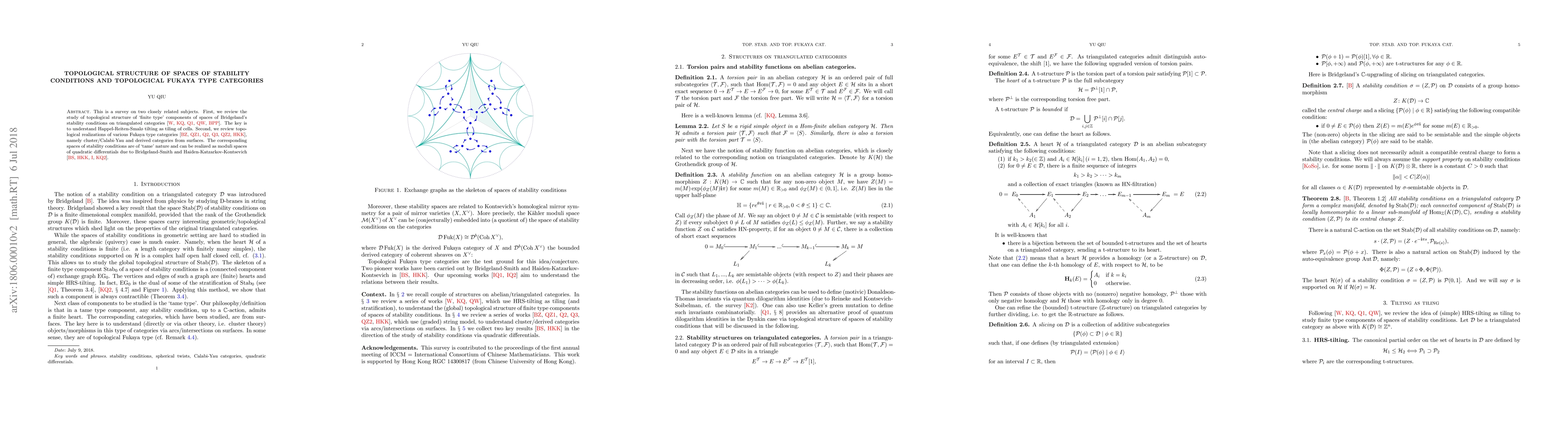 This paper surveys the topological structure of spaces of stability conditions on triangulated categories, focusing on Happel-Reiten-Smalo tilting, and topological realizations of Fukaya type categories, which are realized as moduli spaces of quadratic differentials.
