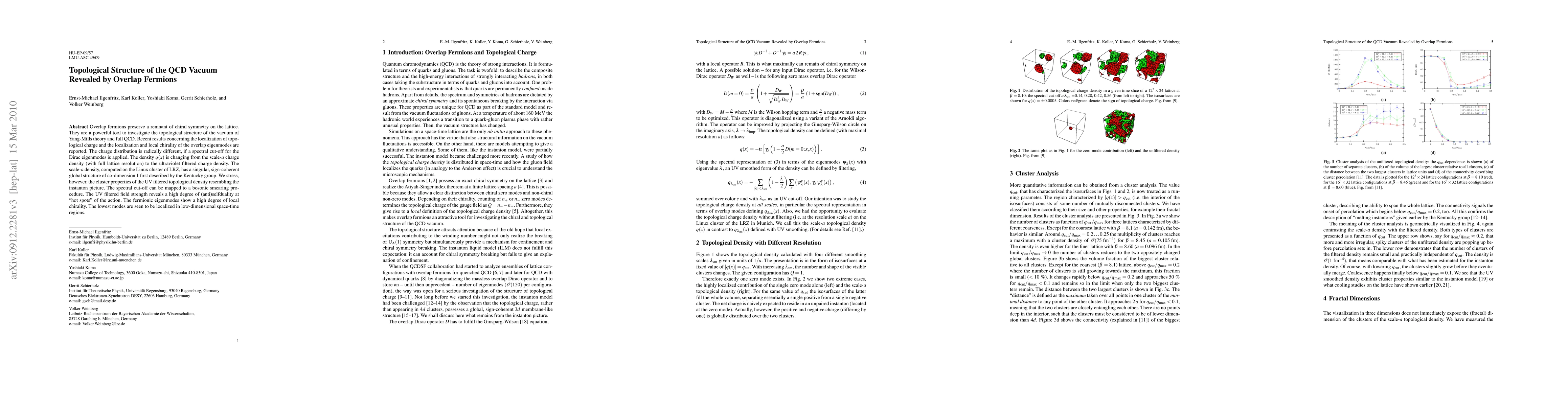 Overlap fermions preserve a remnant of chiral symmetry on the lattice. They are a powerful tool to investigate the topological structure of the vacuum of Yang-Mills theory and full QCD. Recent results concerning the localization of topological charge and the localization and local chirality of the overlap eigenmodes are reported. The charge distribution is radically different, if a spectral cut-off for the Dirac eigenmodes is applied. The density q(x) is changing from the scale-a charge density (with full lattice resolution) to the ultraviolet filtered charge density. The scale-a density, computed on the Linux cluster of LRZ, has a singular, sign-coherent global structure of co-dimension 1 first described by the Kentucky group. We stress, however, the cluster properties of the UV filtered topological density resembling the instanton picture. The spectral cut-off can be mapped to a bosonic smearing procedure. The UV filtered field strength reveals a high degree of (anti)selfduality at "hot spots" of the action. The fermionic eigenmodes show a high degree of local chirality. The lowest modes are seen to be localized in low-dimensional space-time regions.