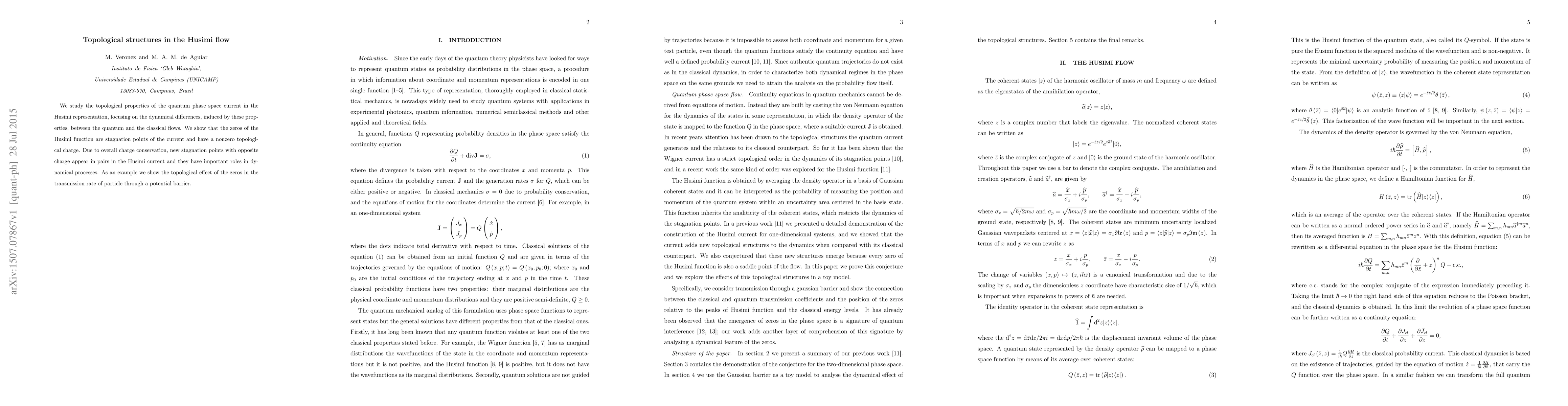 We study the topological properties of the quantum phase space current in the Husimi representation, focusing on the dynamical differences, induced by these properties, between the quantum and the classical flows. We show that the zeros of the Husimi function are stagnation points of the current and have a nonzero topological charge. Due to overall charge conservation, new stagnation points with opposite charge appear in pairs in the Husimi current and they have important roles in dynamical processes. As an example we show the topological effect of the zeros in the transmission rate of particle through a potential barrier.
