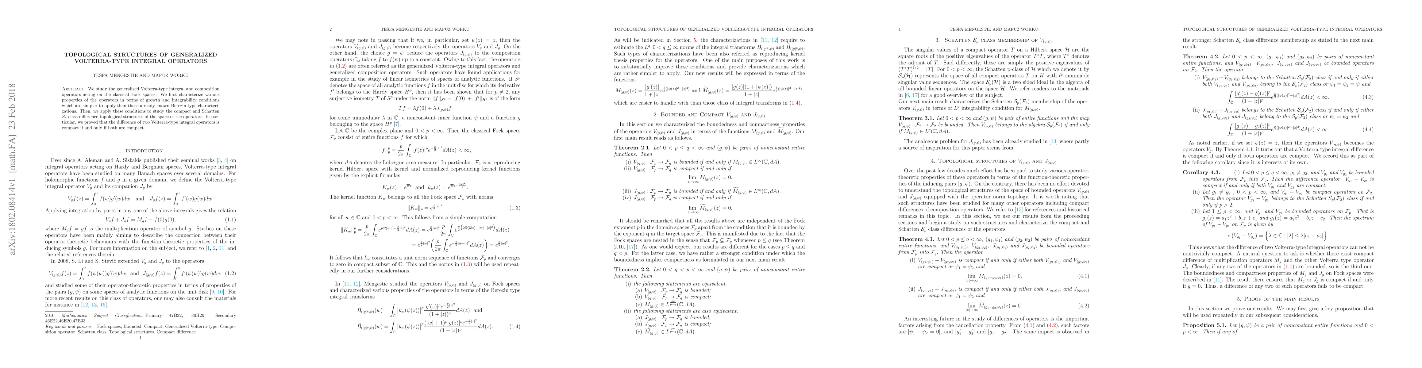This paper explores generalized Volterra-type integral and composition operators on Fock spaces, characterizing their properties through growth and integrability conditions. It further investigates the compact and Schatten $\mathcal{S}_p$ topological structures of these operators, proving that the difference of two such operators is compact if both are compact.