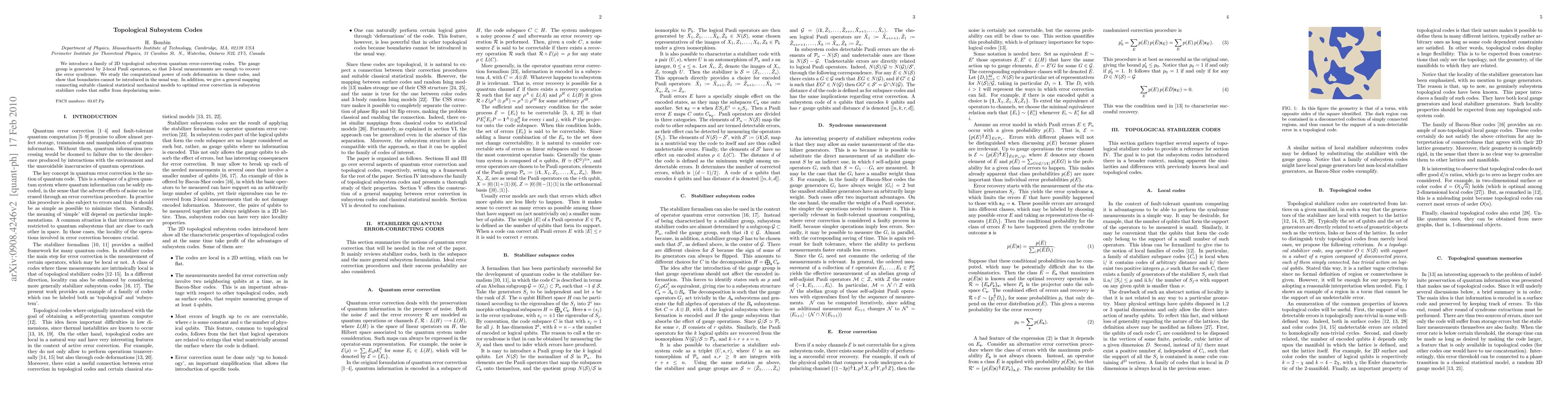 We introduce a family of 2D topological subsystem quantum error-correcting codes. The gauge group is generated by 2-local Pauli operators, so that 2-local measurements are enough to recover the error syndrome. We study the computational power of code deformation in these codes, and show that boundaries cannot be introduced in the usual way. In addition, we give a general mapping connecting suitable classical statistical mechanical models to optimal error correction in subsystem stabilizer codes that suffer from depolarizing noise.