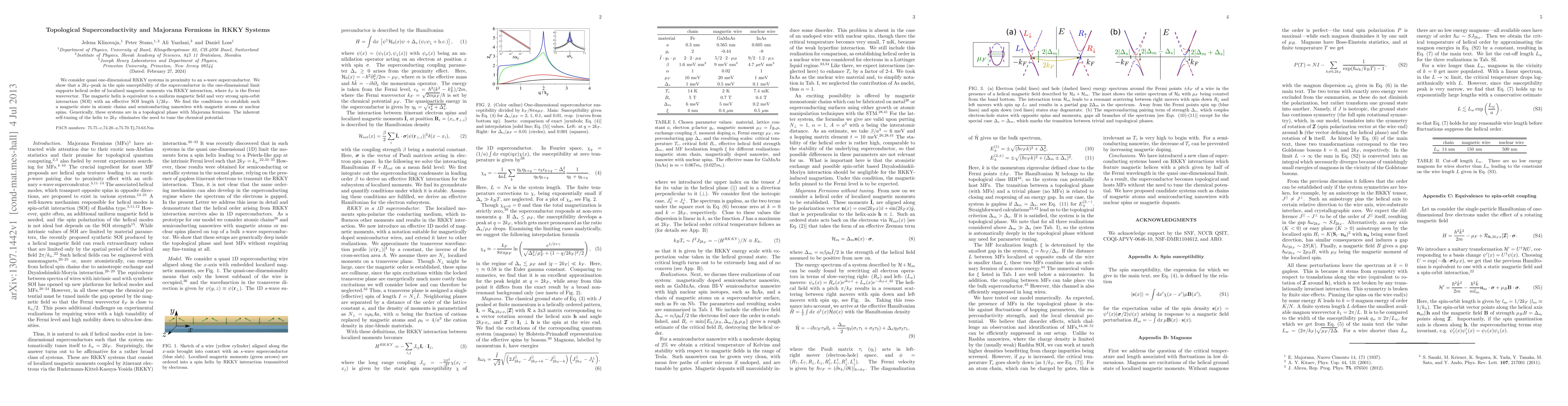 We consider quasi one-dimensional RKKY systems in proximity to an s-wave superconductor. We show that a $2k_F$-peak in the spin susceptibility of the superconductor in the one-dimensional limit supports helical order of localized magnetic moments via RKKY interaction, where $k_F$ is the Fermi wavevector. The magnetic helix is equivalent to a uniform magnetic field and very strong spin-orbit interaction (SOI) with an effective SOI length $1/2k_F$. We find the conditions to establish such a magnetic state in atomic chains and semiconducting nanowires with magnetic atoms or nuclear spins. Generically, these systems are in a topological phase with Majorana fermions. The inherent self-tuning of the helix to $2k_F$ eliminates the need to tune the chemical potential.