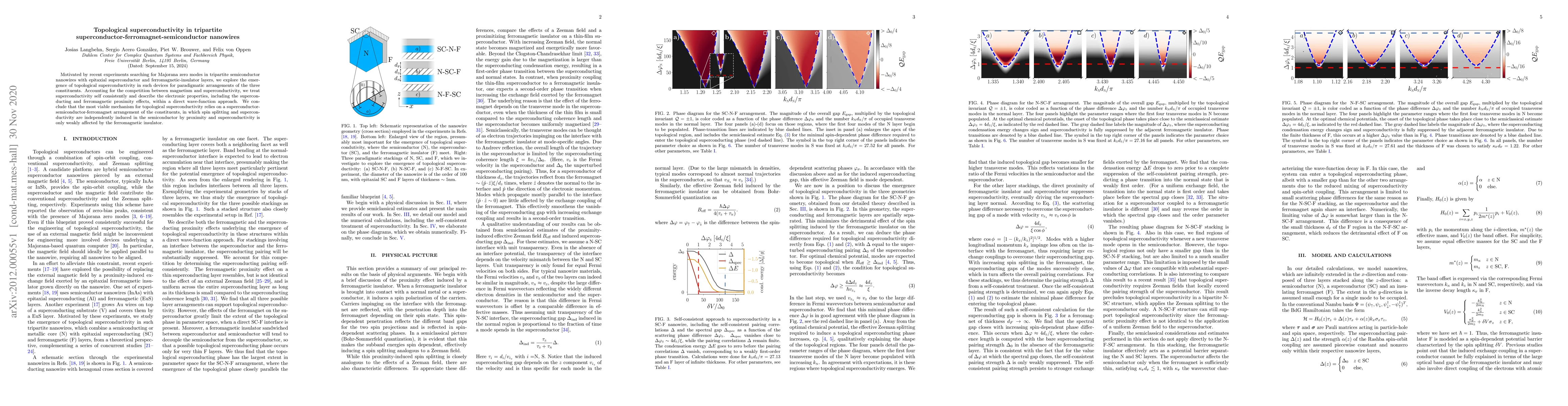 Motivated by recent experiments searching for Majorana zero modes in tripartite semiconductor nanowires with epitaxial superconductor and ferromagnetic-insulator layers, we explore the emergence of topological superconductivity in such devices for paradigmatic arrangements of the three constituents. Accounting for the competition between magnetism and superconductivity, we treat superconductivity self consistently and describe the electronic properties, including the superconducting and ferromagnetic proximity effects, within a direct wave-function approach. We conclude that the most viable mechanism for topological superconductivity relies on a superconductor-semiconductor-ferromagnet arrangement of the constituents, in which spin splitting and superconductivity are independently induced in the semiconductor by proximity and superconductivity is only weakly affected by the ferromagnetic insulator.