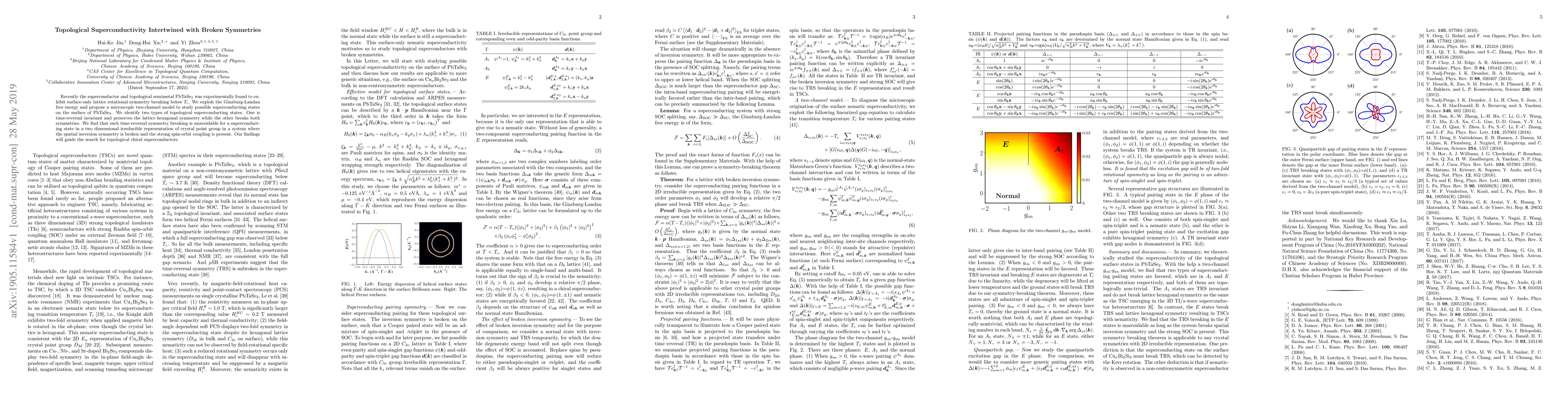 Recently the superconductor and topological semimetal PbTaSe$_2$ was experimentally found to exhibit surface-only lattice rotational symmetry breaking below $T_c$. We exploit the Ginzburg-Landau free energy and propose a microscopic two-channel model to study possible superconducting states on the surface of PbTaSe$_2$. We identify two types of topological superconducting states. One is time-reversal invariant and preserves the lattice hexagonal symmetry while the other breaks both symmetries. We find that such time-reversal symmetry breaking is unavoidable for a superconducting state in a two dimensional irreducible representation of crystal point group in a system where the spatial inversion symmetry is broken and the strong spin-orbit coupling is present. Our findings will guide the search for topological chiral superconductors.