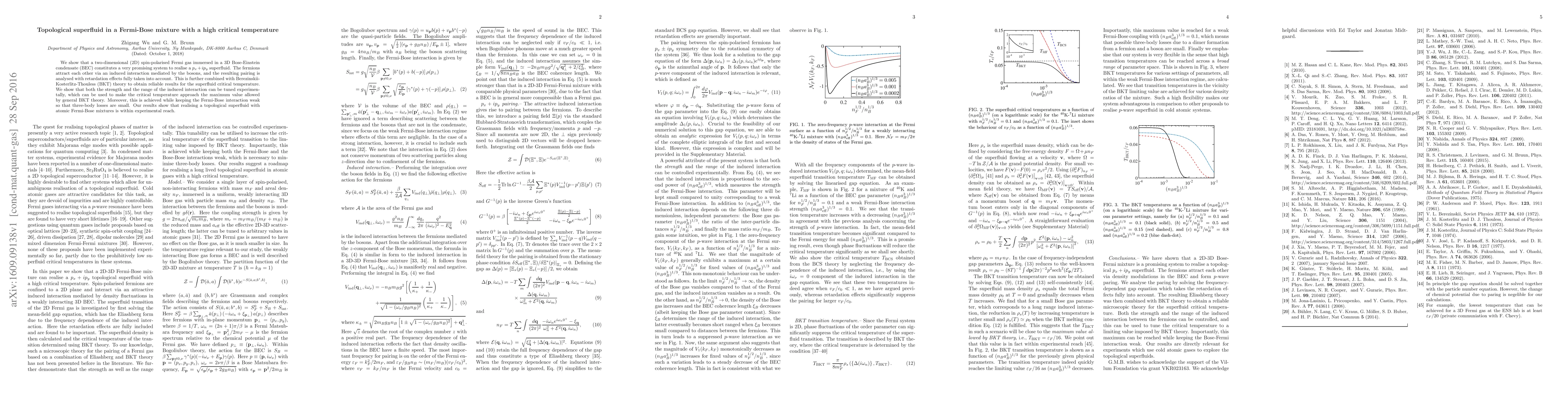 This paper demonstrates that a 2D spin-polarised Fermi gas within a 3D Bose-Einstein condensate can realize a $p_x+ip_y$ topological superfluid, with a high critical temperature achievable through experimental tuning of the induced interaction. The study combines detailed pairing analysis and BKT theory to achieve this goal while minimizing three-body losses.