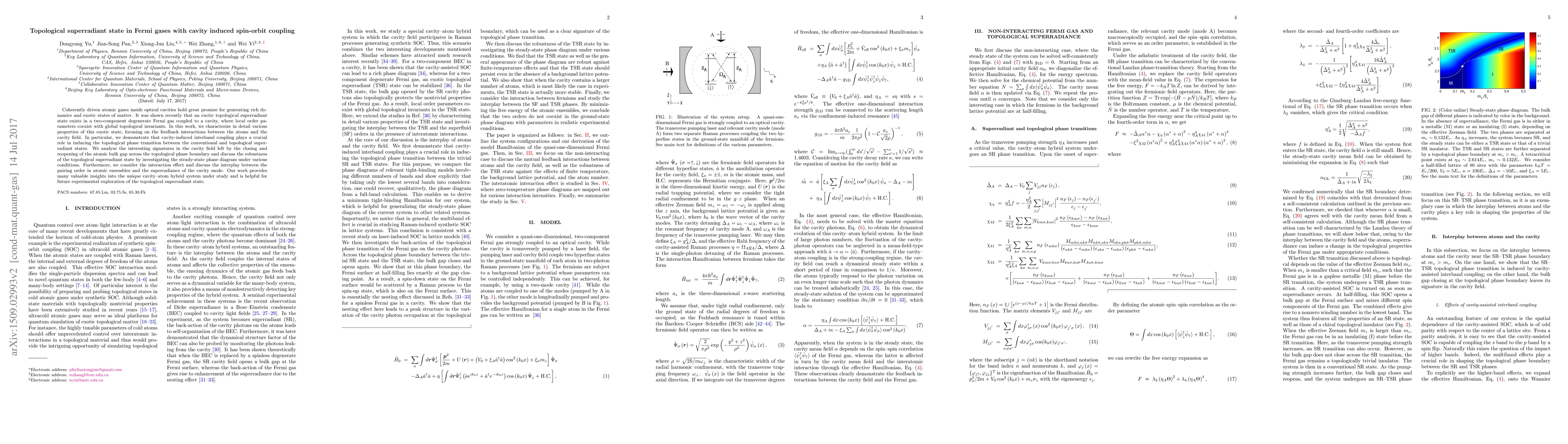 Coherently driven atomic gases inside optical cavities hold great promise for generating rich dynamics and exotic states of matter. It was shown recently that an exotic topological superradiant state exists in a two-component degenerate Fermi gas coupled to a cavity, where local order parameters coexist with global topological invariants. In this work, we characterize in detail various properties of this exotic state, focusing on the feedback interactions between the atoms and the cavity field. In particular, we demonstrate that cavity-induced interband coupling plays a crucial role in inducing the topological phase transition between the conventional and topological superradiant states. We analyze the interesting signatures in the cavity field left by the closing and reopening of the atomic bulk gap across the topological phase boundary and discuss the robustness of the topological superradiant state by investigating the steady-state phase diagram under various conditions. Furthermore, we consider the interaction effect and discuss the interplay between the pairing order in atomic ensembles and the superradiance of the cavity mode. Our work provides many valuable insights into the unique cavity--atom hybrid system under study and is helpful for future experimental exploration of the topological superradiant state.