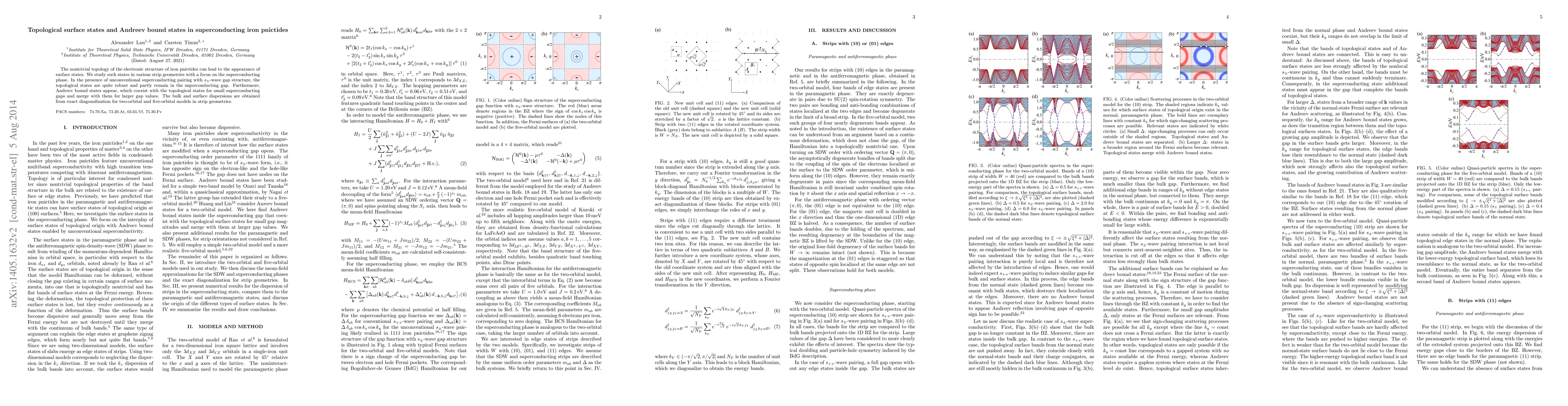 The nontrivial topology of the electronic structure of iron pnictides can lead to the appearance of surface states. We study such states in various strip geometries with a focus on the superconducting phase. In the presence of unconventional superconducting pairing with $s_\pm$-wave gap structure, the topological states are quite robust and partly remain in the superconducting gap. Furthermore, Andreev bound states appear, which coexist with the topological states for small superconducting gaps and merge with them for larger gap values. The bulk and surface dispersions are obtained from exact diagonalization for two-orbital and five-orbital models in strip geometries.