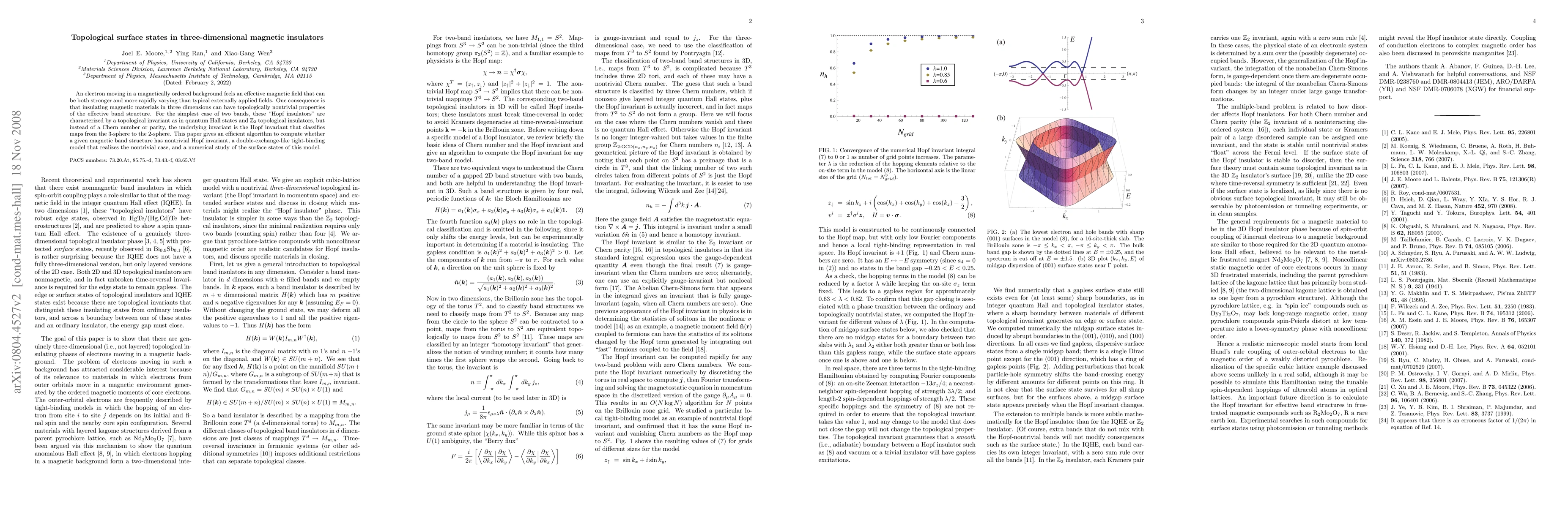 This paper explores topological surface states in three-dimensional magnetic insulators, introducing "Hopf insulators" characterized by a Hopf invariant. It provides an algorithm for determining nontrivial Hopf invariants and presents a tight-binding model to realize these states, followed by a numerical study of their surface states.