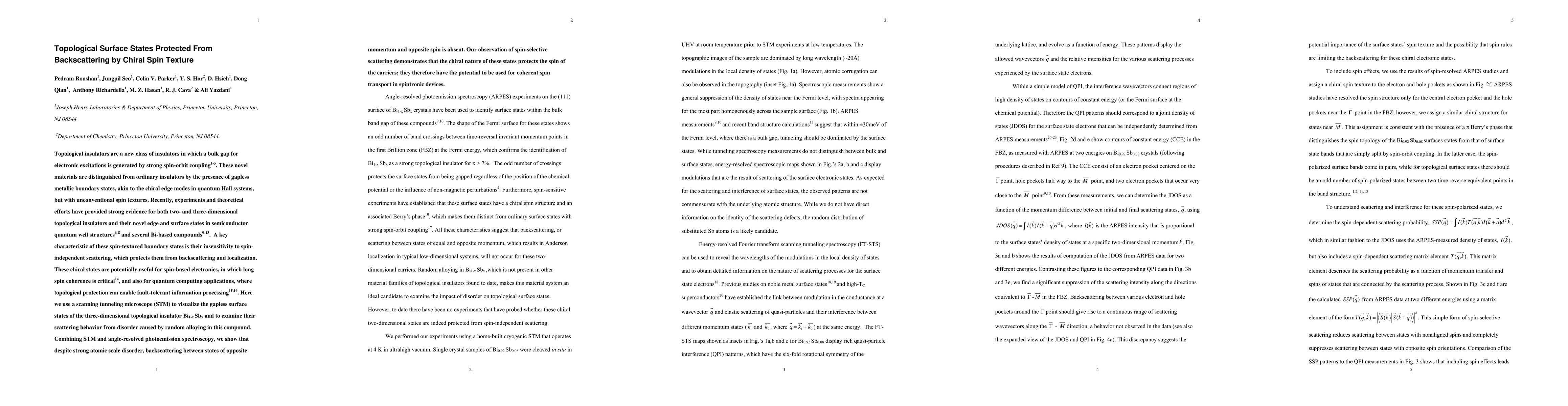Topological insulators are a new class of insulators in which a bulk gap for electronic excitations is generated by strong spin orbit coupling. These novel materials are distinguished from ordinary insulators by the presence of gapless metallic boundary states, akin to the chiral edge modes in quantum Hall systems, but with unconventional spin textures. Recently, experiments and theoretical efforts have provided strong evidence for both two- and three-dimensional topological insulators and their novel edge and surface states in semiconductor quantum well structures and several Bi-based compounds. A key characteristic of these spin-textured boundary states is their insensitivity to spin-independent scattering, which protects them from backscattering and localization. These chiral states are potentially useful for spin-based electronics, in which long spin coherence is critical, and also for quantum computing applications, where topological protection can enable fault-tolerant information processing. Here we use a scanning tunneling microscope (STM) to visualize the gapless surface states of the three-dimensional topological insulator BiSb and to examine their scattering behavior from disorder caused by random alloying in this compound. Combining STM and angle-resolved photoemission spectroscopy, we show that despite strong atomic scale disorder, backscattering between states of opposite momentum and opposite spin is absent. Our observation of spin-selective scattering demonstrates that the chiral nature of these states protects the spin of the carriers; they therefore have the potential to be used for coherent spin transport in spintronic devices.