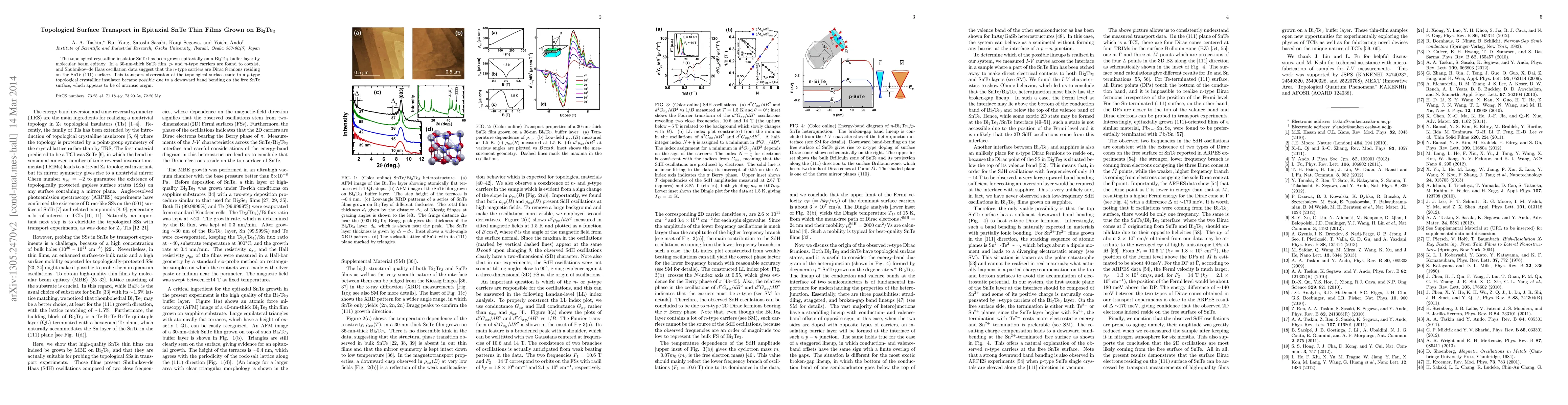 This study demonstrates epitaxial growth of SnTe on Bi2Te3, revealing coexisting p- and n-type carriers in a 30-nm SnTe film. The n-type carriers exhibit Dirac fermion behavior on the SnTe (111) surface, indicating the presence of topological surface transport states.