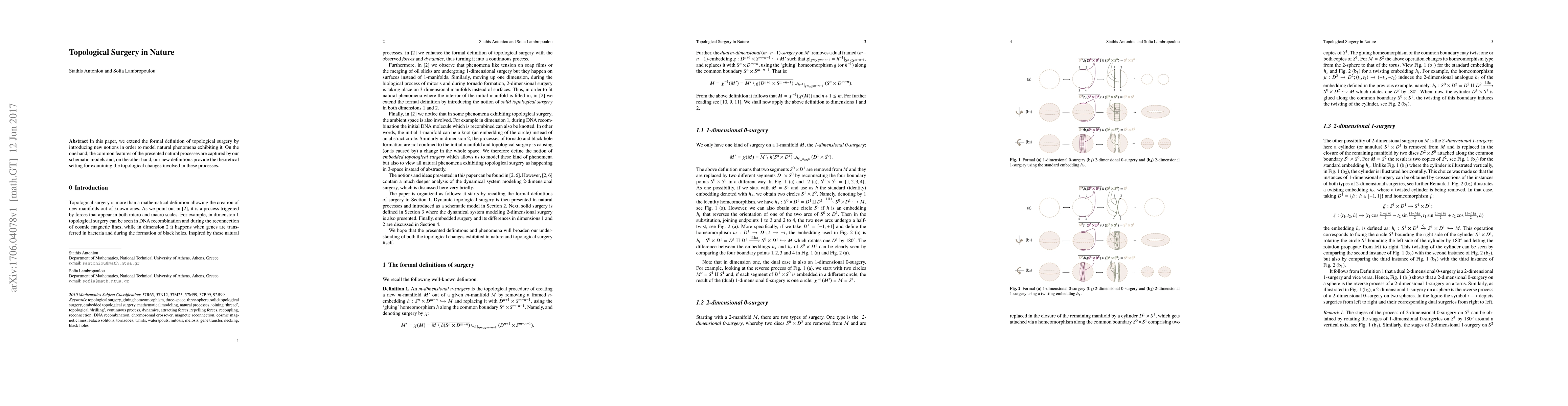 In this paper, we extend the formal definition of topological surgery by introducing new notions in order to model natural phenomena exhibiting it. On the one hand, the common features of the presented natural processes are captured by our schematic models and, on the other hand, our new definitions provide the theoretical setting for examining the topological changes involved in these processes.