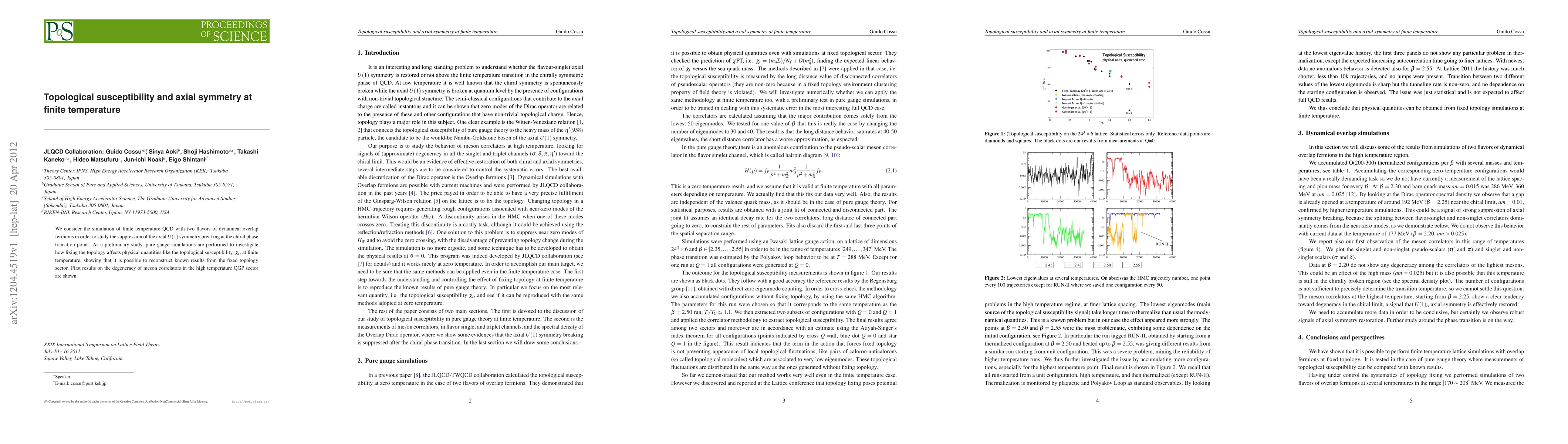 This research uses overlap fermions in finite temp. QCD simulations with 2 flavors to study axial U(1) symmetry suppression at chiral transition. Preliminary pure gauge simulations show topology fixation reconstructs known topological susceptibility ($chi_t$) results. Initial findings on meson correlator degeneracy in high temp. QGP sector are presented.