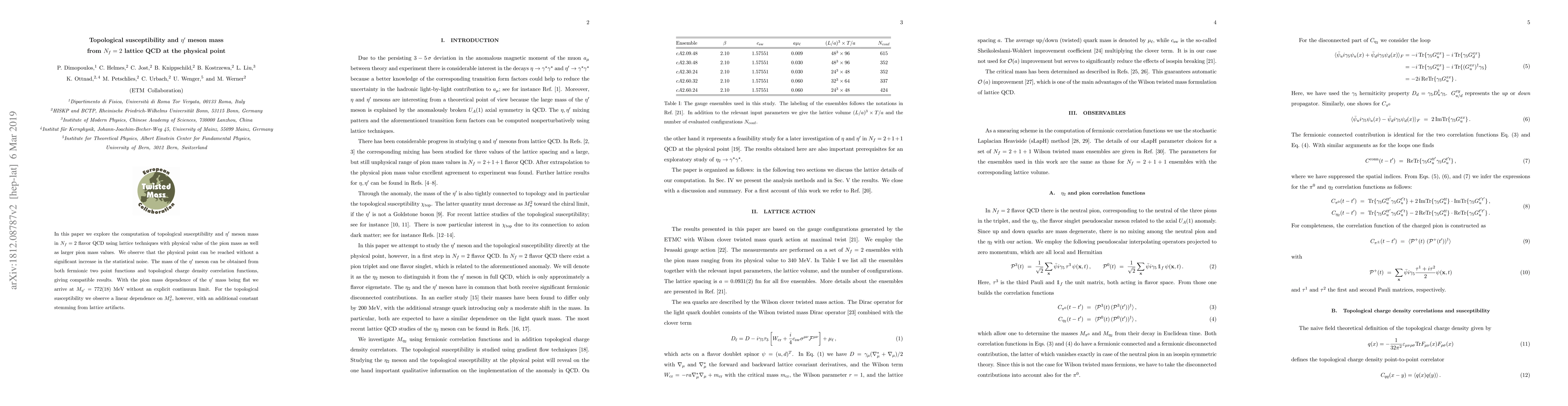 This paper investigates the topological susceptibility and $\eta'$ meson mass in $N_f=2$ lattice QCD at the physical pion mass, finding compatible results from different methods. The $\eta'$ mass is determined to be $M_{\eta'}= 772(18)\ \mathrm{MeV}$ without requiring a continuum limit, while topological susceptibility shows a linear dependence on $M_\pi^2$ with lattice artifacts.