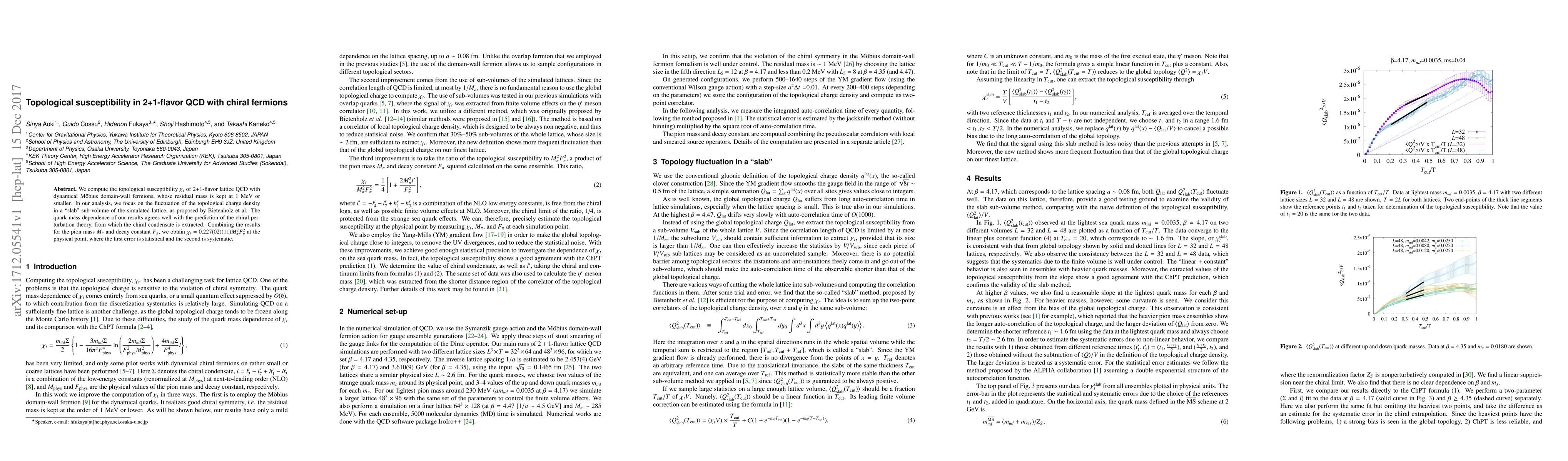 The study computes the topological susceptibility ($\\chi_t$) of 2+1-flavor QCD with dynamical Möbius domain-wall fermions, maintaining residual mass at 1 MeV or smaller. It focuses on the fluctuation of topological charge density in a 'slab' sub-volume of the simulated lattice, using the clover construction for the topological charge density. The method involves YM gradient flow to smooth gauge fields and extracts $\\chi_t$ from the integrated auto-correlation time of quantities.