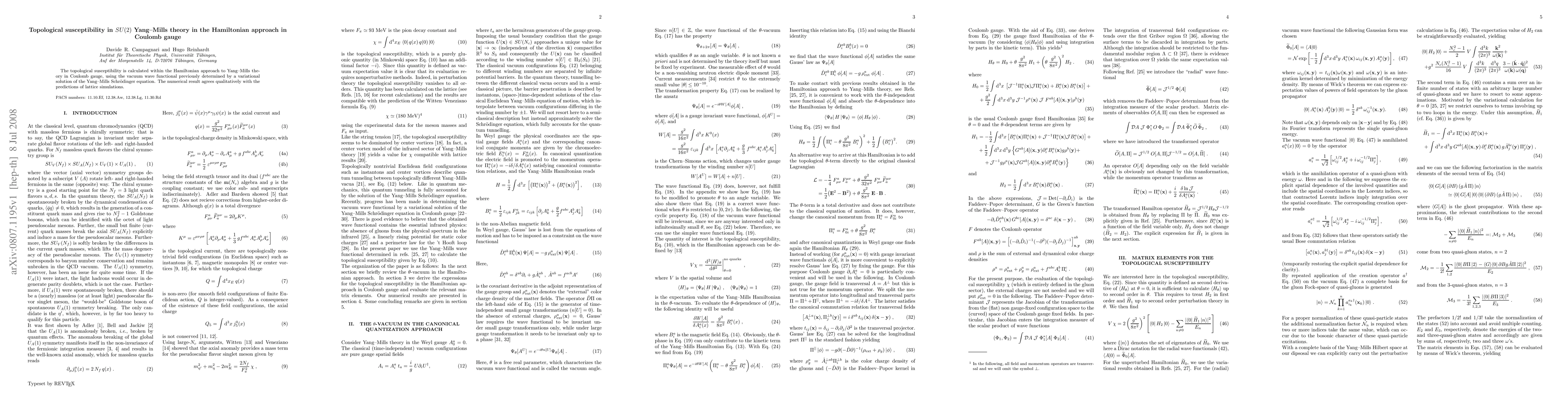 This paper calculates topological susceptibility in SU(2) Yang-Mills theory via Hamiltonian approach in Coulomb gauge, using a previously derived vacuum wave functional, and finds qualitative agreement with lattice simulation results.