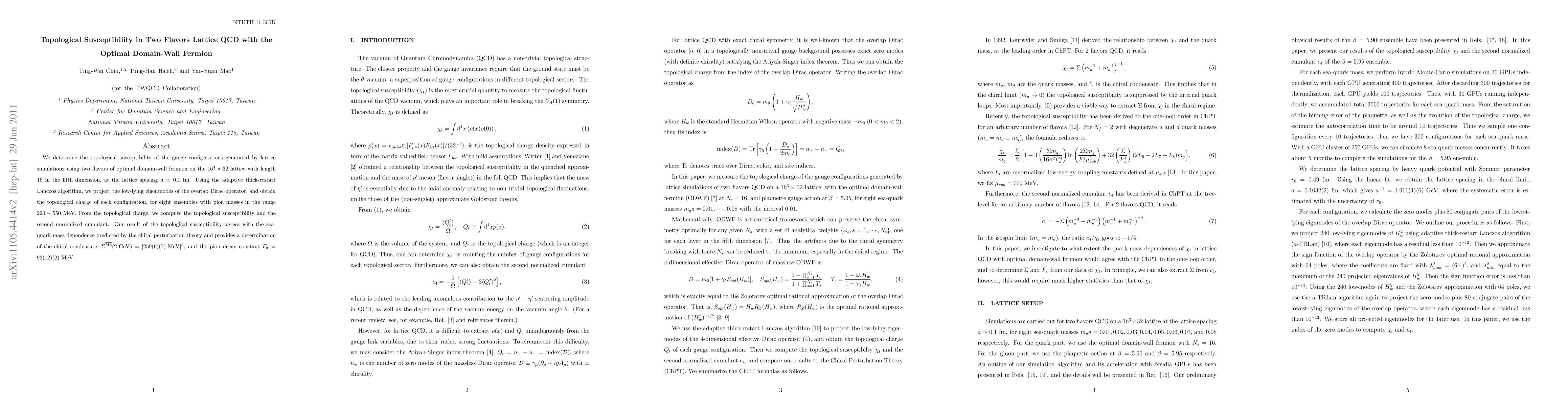 This paper calculates the topological susceptibility in two-flavor lattice QCD using optimal domain-wall fermions, finding results consistent with chiral perturbation theory predictions. It also determines the chiral condensate and pion decay constant from the simulations.