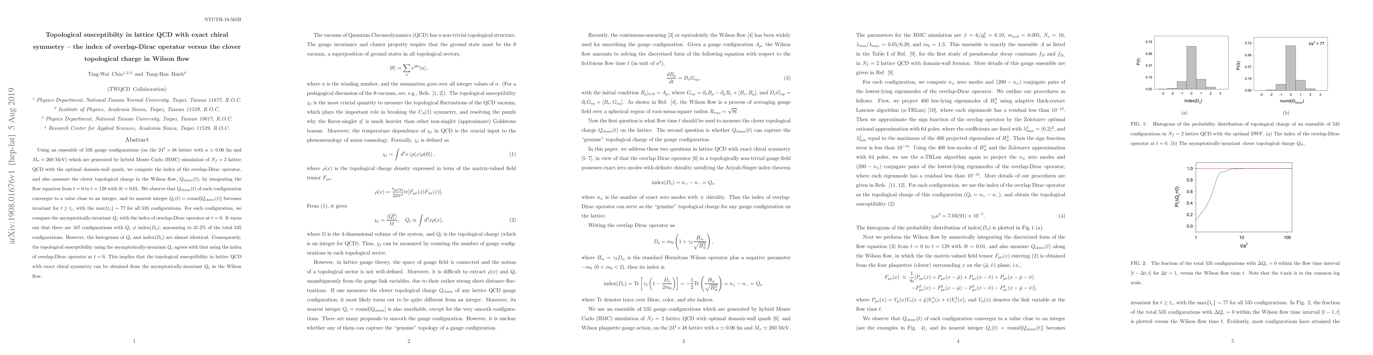 Using an ensemble of 535 gauge configurations (on the $24^4 \times 48 $ lattice with $ a \simeq 0.06 $~fm and $ M_{\pi} \simeq 260 $~MeV) which are generated by hybrid Monte Carlo (HMC) simulation of $N_f=2$ lattice QCD with the optimal domain-wall quark, we compute the index of the overlap-Dirac operator, and also measure the clover topological charge in the Wilson flow, $Q_{\text{clover}}(t) $, by integrating the flow equation from $ t = 0 $ to $ t = 128 $ with $\delta t = 0.01 $. We observe that $Q_{\text{clover}}(t) $ of each configuration converges to a value close to an integer, and its nearest integer $Q_c(t) = \text{round} [Q_{\text{clover}}(t)] $ becomes invariant for $ t \ge t_c $, with the $ \max\{t_c \} \sim 77 $ for all 535 configurations. For each configuration, we compare the asymptotically-invariant $ Q_c $ with the index of overlap-Dirac operator at $t=0$. It turns out that there are 167 configurations with $Q_c \ne \text{index}(D_{o}) $, amounting to $31.2\%$ of the total 535 configurations. However, the histograms of $ Q_c $ and $ \text{index}(D_o) $ are almost identical. Consequently, the topological susceptibility using the asymptotically-invariant $ Q_c $ agrees with that using the index of overlap-Dirac operator at $ t=0 $. This implies that the topological susceptibility in lattice QCD with exact chiral symmetry can be obtained from the asymptotically-invariant $ Q_c $ in the Wilson flow.