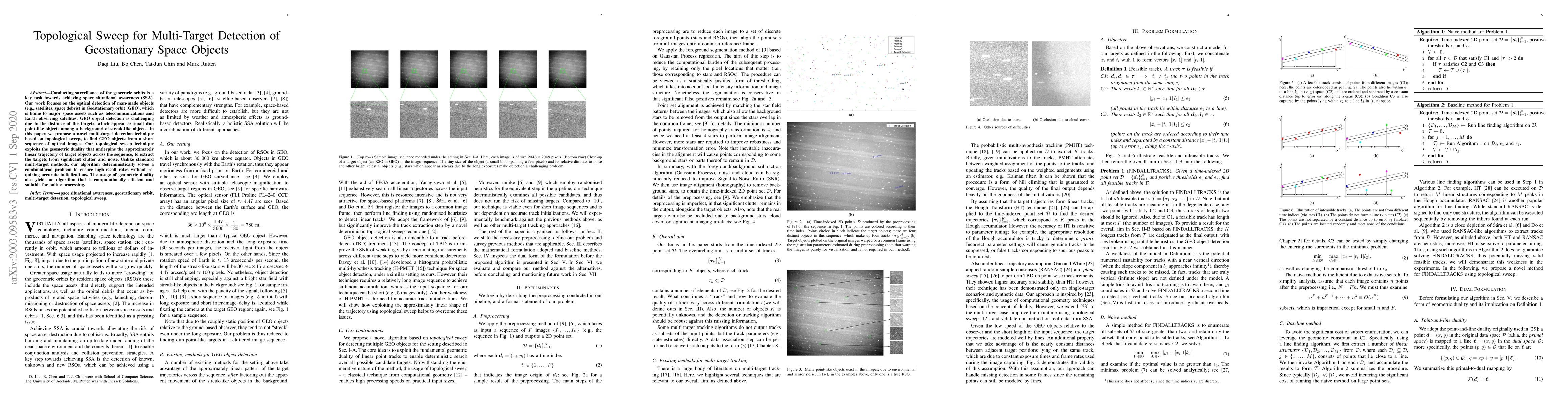 This research introduces a novel topological sweep method for detecting multiple objects in Geostationary Earth Orbit (GEO), addressing the challenge of distinguishing small, dim space objects from bright stars. The technique leverages geometric duality to efficiently solve a combinatorial problem, ensuring high-recall rates and suitability for real-time processing, without the need for precise initializations.