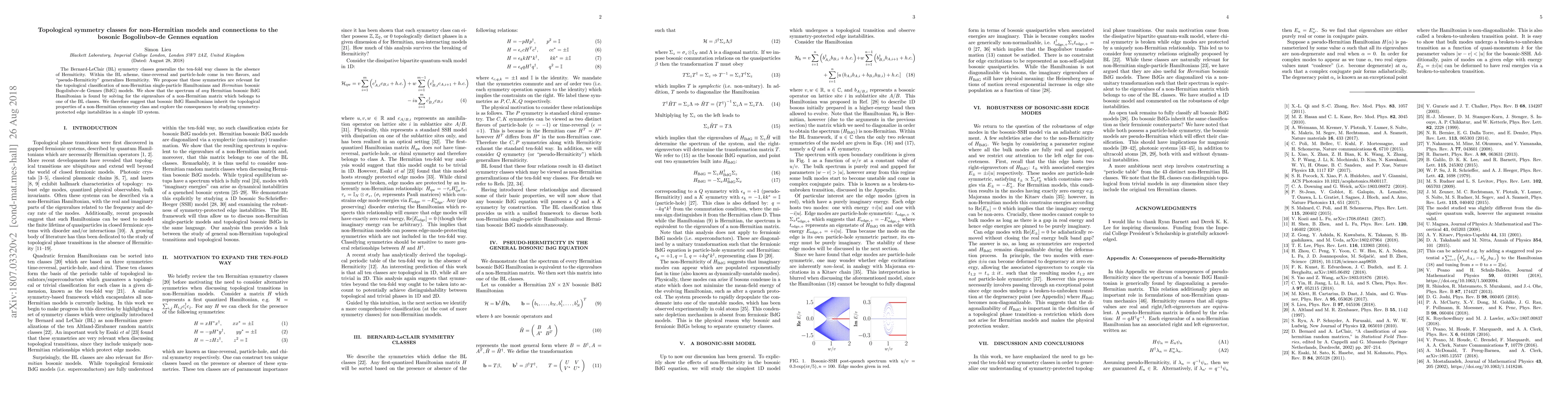 The Bernard-LeClair (BL) symmetry classes generalize the ten-fold way classes in the absence of Hermiticity. Within the BL scheme, time-reversal and particle-hole come in two flavors, and "pseudo-Hermiticity" generalizes Hermiticity. We propose that these symmetries are relevant for the topological classification of non-Hermitian single-particle Hamiltonians and Hermitian bosonic Bogoliubov-de Gennes (BdG) models. We show that the spectrum of any Hermitian bosonic BdG Hamiltonian is found by solving for the eigenvalues of a non-Hermitian matrix which belongs to one of the BL classes. We therefore suggest that bosonic BdG Hamiltonians inherit the topological properties of a non-Hermitian symmetry class and explore the consequences by studying symmetry-protected edge instabilities in a simple 1D system.