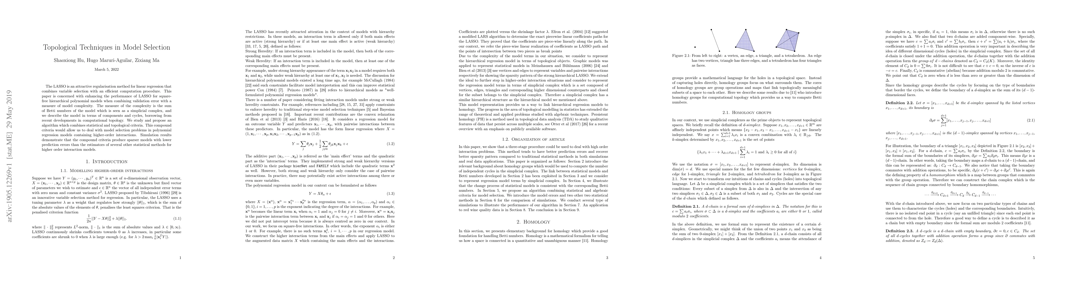 The LASSO is an attractive regularisation method for linear regression that combines variable selection with an efficient computation procedure. This paper is concerned with enhancing the performance of LASSO for square-free hierarchical polynomial models when combining validation error with a measure of model complexity. The measure of the complexity is the sum of Betti numbers of the model which is seen as a simplicial complex, and we describe the model in terms of components and cycles, borrowing from recent developments in computational topology. We study and propose an algorithm which combines statistical and topological criteria. This compound criterion would allow us to deal with model selection problems in polynomial regression models containing higher-order interactions. Simulation results demonstrate that the compound criteria produce sparser models with lower prediction errors than the estimators of several other statistical methods for higher order interaction models.