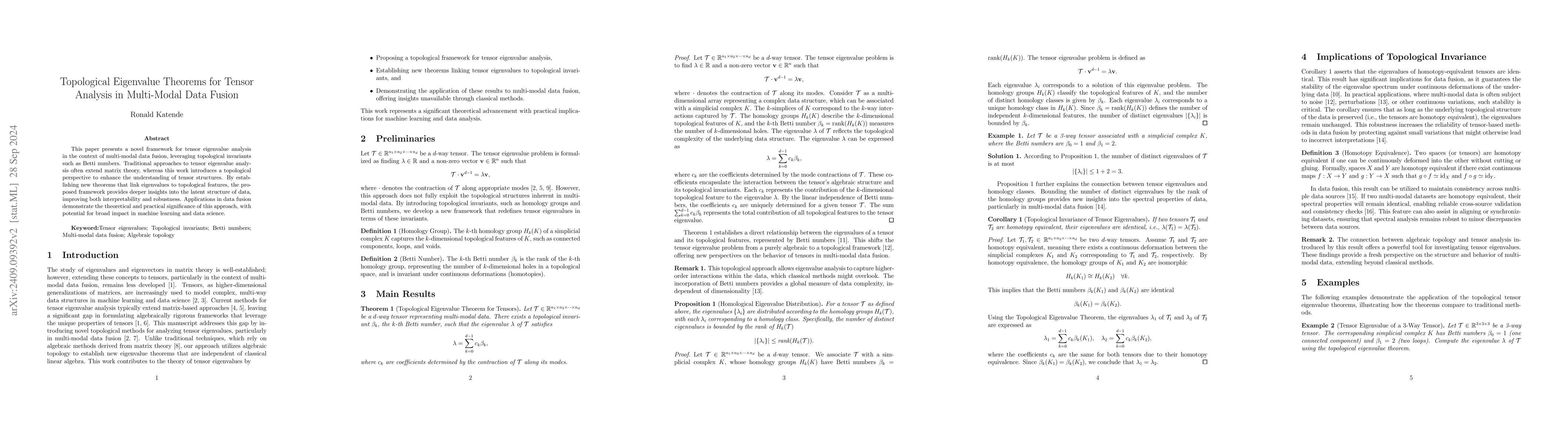 This paper presents a topological framework for tensor eigenvalue analysis in multi-modal data fusion, using Betti numbers to link eigenvalues with topological features, enhancing interpretability and robustness. The novel theorems and applications showcase significant potential for advancements in machine learning and data science.
