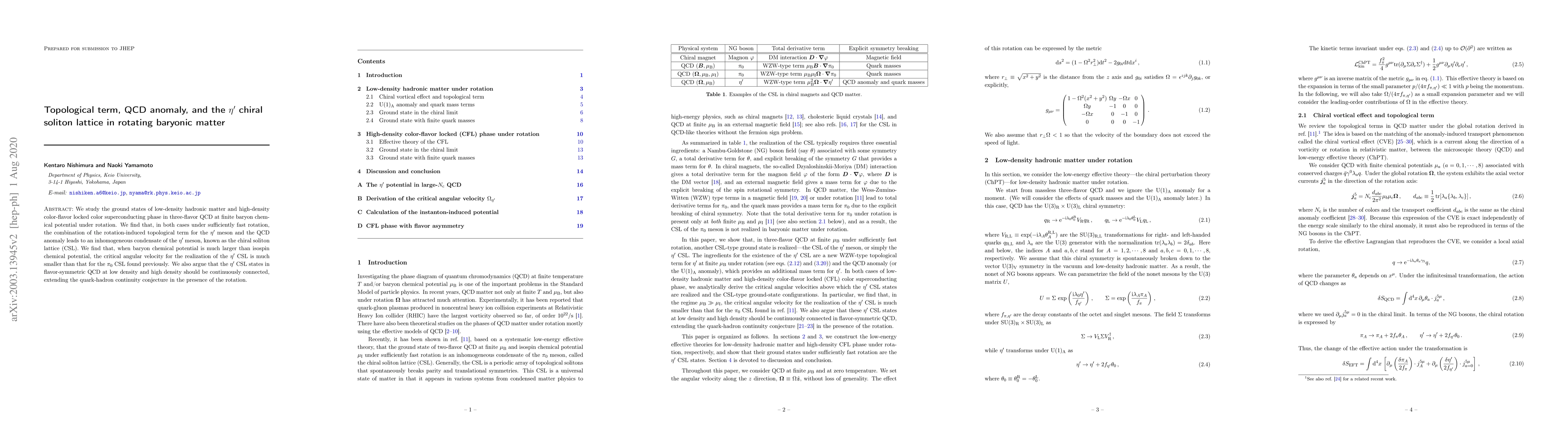 We study the ground states of low-density hadronic matter and high-density color-flavor locked color superconducting phase in three-flavor QCD at finite baryon chemical potential under rotation. We find that, in both cases under sufficiently fast rotation, the combination of the rotation-induced topological term for the eta' meson and the QCD anomaly leads to an inhomogeneous condensate of the eta' meson, known as the chiral soliton lattice (CSL). We find that, when baryon chemical potential is much larger than isospin chemical potential, the critical angular velocity for the realization of the eta' CSL is much smaller than that for the pi_0 CSL found previously. We also argue that the eta' CSL states in flavor-symmetric QCD at low density and high density should be continuously connected, extending the quark-hadron continuity conjecture in the presence of the rotation.