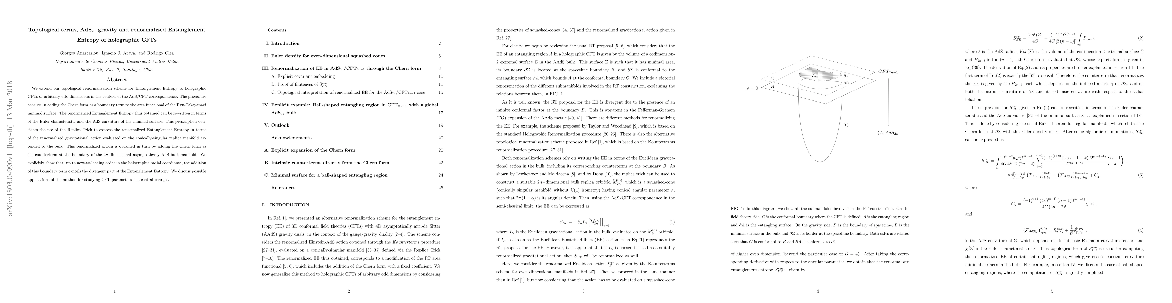 We extend our topological renormalization scheme for Entanglement Entropy to holographic CFTs of arbitrary odd dimensions in the context of the AdS/CFT correspondence. The procedure consists in adding the Chern form as a boundary term to the area functional of the Ryu-Takayanagi minimal surface. The renormalized Entanglement Entropy thus obtained can be rewritten in terms of the Euler characteristic and the AdS curvature of the minimal surface. This prescription considers the use of the Replica Trick to express the renormalized Entanglement Entropy in terms of the renormalized gravitational action evaluated on the conically-singular replica manifold extended to the bulk. This renormalized action is obtained in turn by adding the Chern form as the counterterm at the boundary of the 2n-dimensional asymptotically AdS bulk manifold. We explicitly show that, up to next-to-leading order in the holographic radial coordinate, the addition of this boundary term cancels the divergent part of the Entanglement Entropy. We discuss possible applications of the method for studying CFT parameters like central charges.