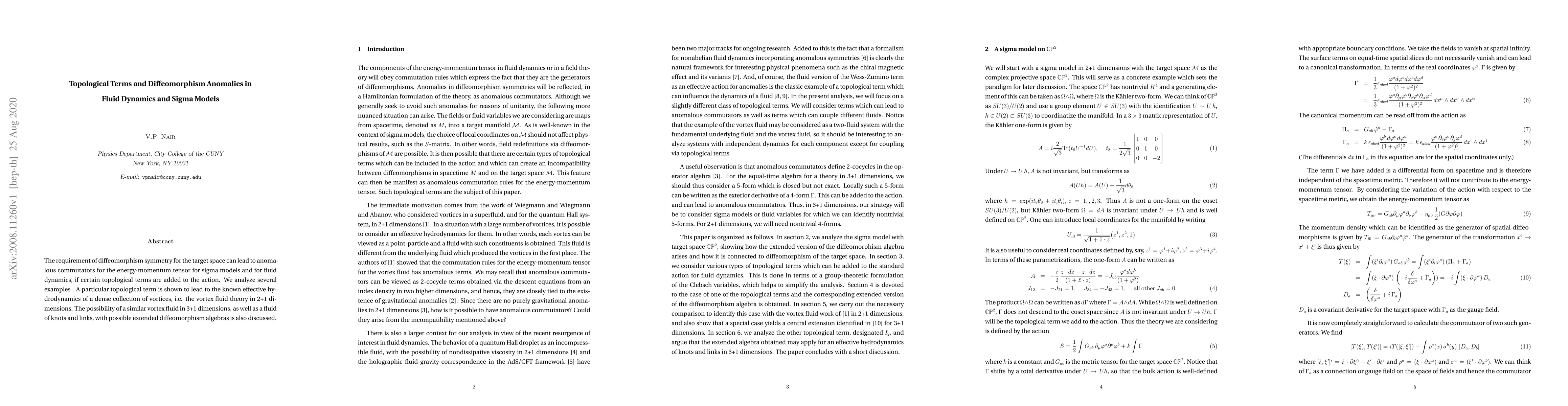 The requirement of diffeomorphism symmetry for the target space can lead to anomalous commutators for the energy-momentum tensor for sigma models and for fluid dynamics, if certain topological terms are added to the action. We analyze several examples . A particular topological term is shown to lead to the known effective hydrodynamics of a dense collection of vortices, i.e. the vortex fluid theory in 2+1 dimensions. The possibility of a similar vortex fluid in 3+1 dimensions, as well as a fluid of knots and links, with possible extended diffeomorphism algebras is also discussed.