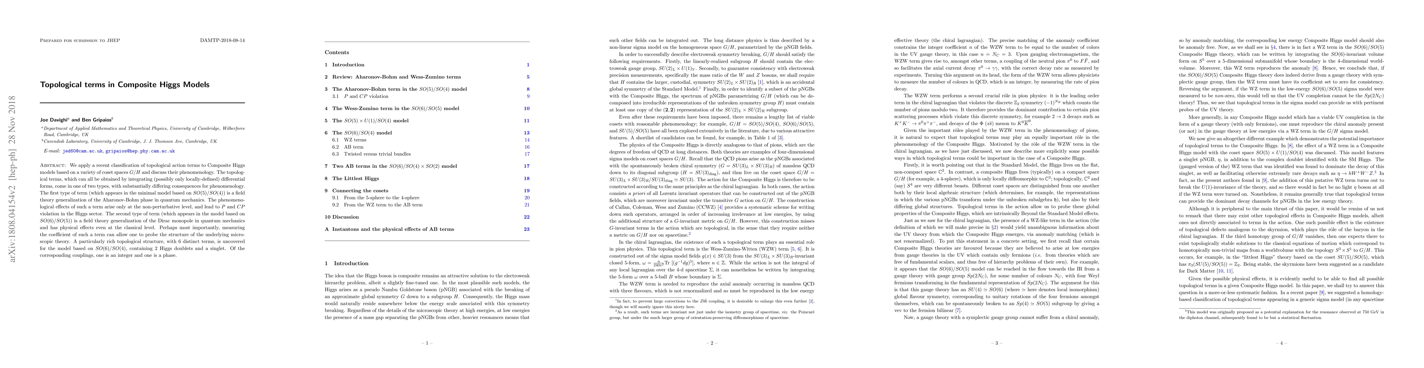We apply a recent classification of topological action terms to Composite Higgs models based on a variety of coset spaces $G/H$ and discuss their phenomenology. The topological terms, which can all be obtained by integrating (possibly only locally-defined) differential forms, come in one of two types, with substantially differing consequences for phenomenology. The first type of term (which appears in the minimal model based on $SO(5)/SO(4)$) is a field theory generalization of the Aharonov-Bohm phase in quantum mechanics. The phenomenological effects of such a term arise only at the non-perturbative level, and lead to $P$ and $CP$ violation in the Higgs sector. The second type of term (which appears in the model based on $SO(6)/SO(5)$) is a field theory generalization of the Dirac monopole in quantum mechanics and has physical effects even at the classical level. Perhaps most importantly, measuring the coefficient of such a term can allow one to probe the structure of the underlying microscopic theory. A particularly rich topological structure, with 6 distinct terms, is uncovered for the model based on $SO(6)/SO(4)$, containing 2 Higgs doublets and a singlet. Of the corresponding couplings, one is an integer and one is a phase.