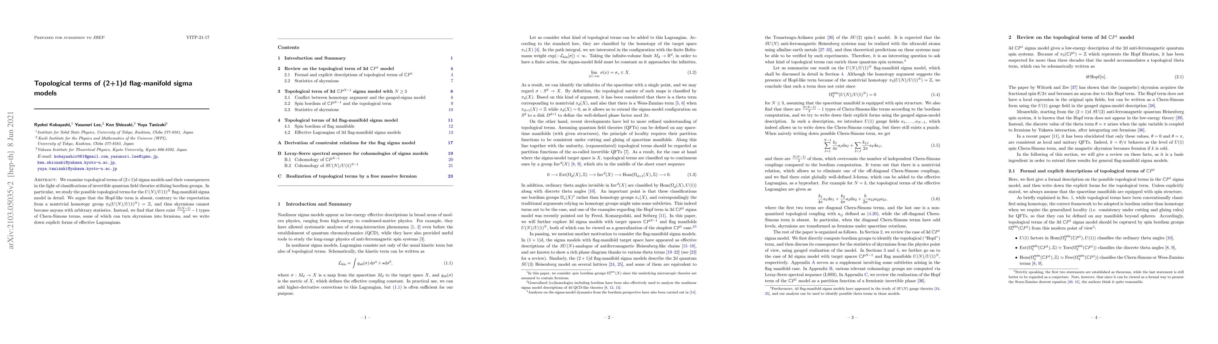 We examine topological terms of $(2+1)$d sigma models and their consequences in the light of classifications of invertible quantum field theories utilizing bordism groups. In particular, we study the possible topological terms for the $U(N)/U(1)^N$ flag-manifold sigma model in detail. We argue that the Hopf-like term is absent, contrary to the expectation from a nontrivial homotopy group $\pi_3(U(N)/U(1)^N)=\mathbb{Z}$, and thus skyrmions cannot become anyons with arbitrary statistics. Instead, we find that there exist ${N(N-1)\over 2}-1$ types of Chern-Simons terms, some of which can turn skyrmions into fermions, and we write down explicit forms of effective Lagrangians.