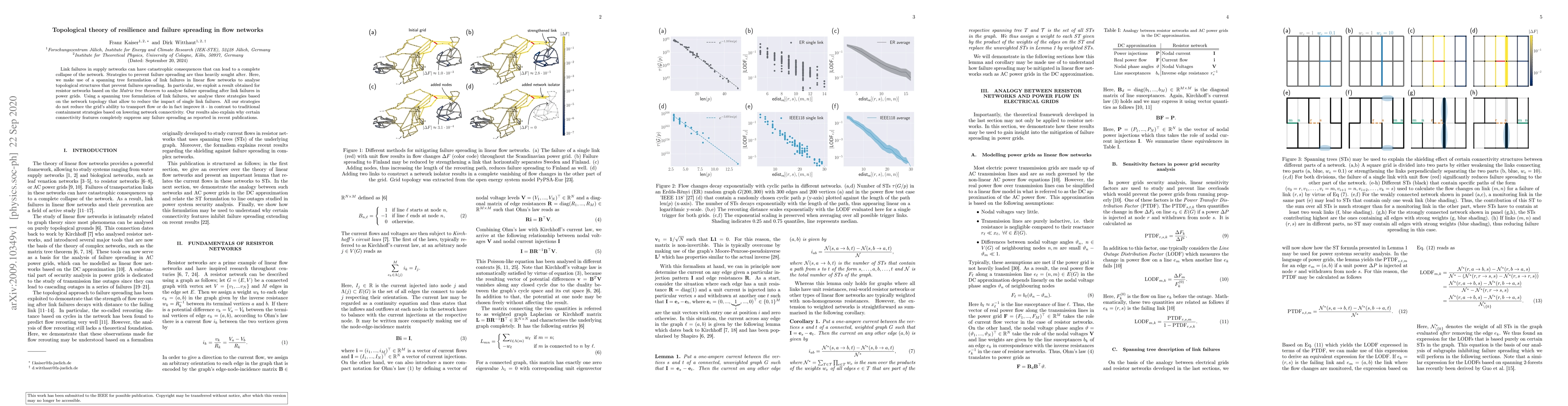 Link failures in supply networks can have catastrophic consequences that can lead to a complete collapse of the network. Strategies to prevent failure spreading are thus heavily sought after. Here, we make use of a spanning tree formulation of link failures in linear flow networks to analyse topological structures that prevent failures spreading. In particular, we exploit a result obtained for resistor networks based on the \textit{Matrix tree theorem} to analyse failure spreading after link failures in power grids. Using a spanning tree formulation of link failures, we analyse three strategies based on the network topology that allow to reduce the impact of single link failures. All our strategies do not reduce the grid's ability to transport flow or do in fact improve it - in contrast to traditional containment strategies based on lowering network connectivity. Our results also explain why certain connectivity features completely suppress any failure spreading as reported in recent publications.