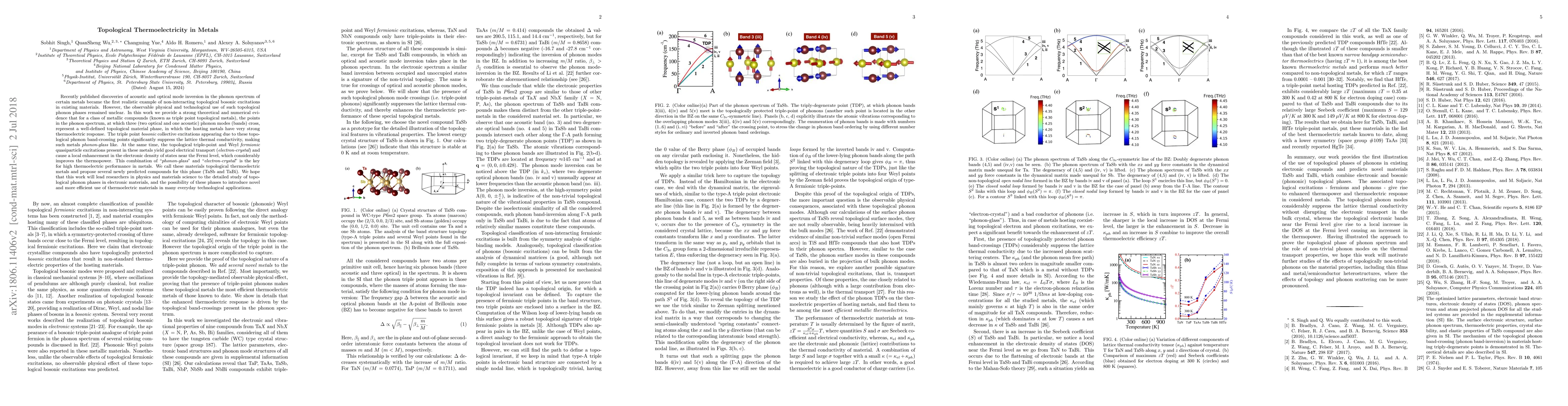 Certain metals exhibit topological thermoelectricity due to phonon band-crossing points, leading to high thermopower and low thermal conductivity, making them promising materials for efficient thermoelectric applications.